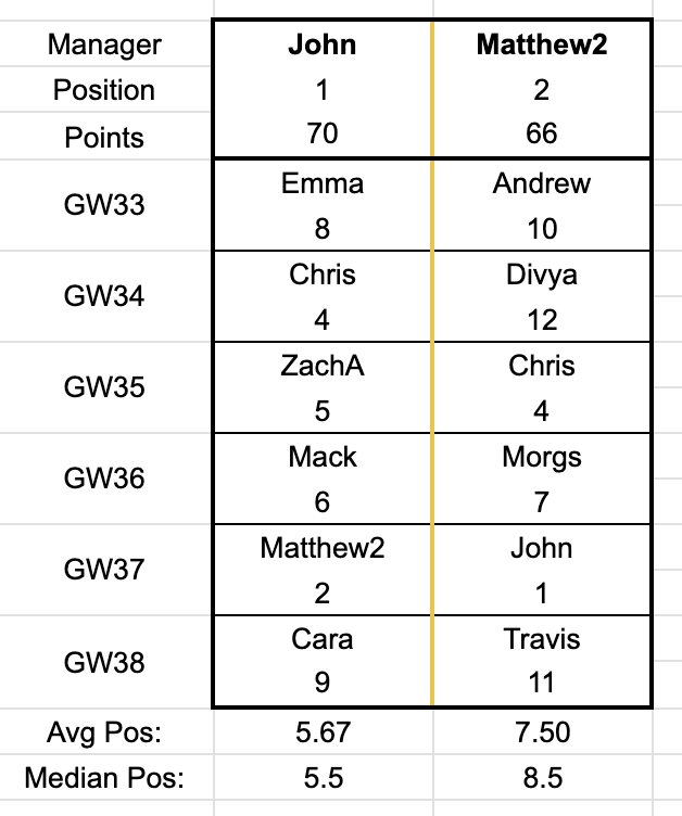 5 - Darryan (-3) - League A - Last 5: 43 (W), 65 (W), 34 (L), 28 (L), 32 (L) - 3 losses in 3 and not a score over 34 since his 65 pointer definitely puts some question marks around Darryan's title chances in the run in. That said, if he can figure out his bench, Xhaka, Scott, Rodri, and Haaland ahead of a couple Arsenal defenders and Kelleher seems like it could be enough to take him to the promised land (if he can beat Zach in their head to head).