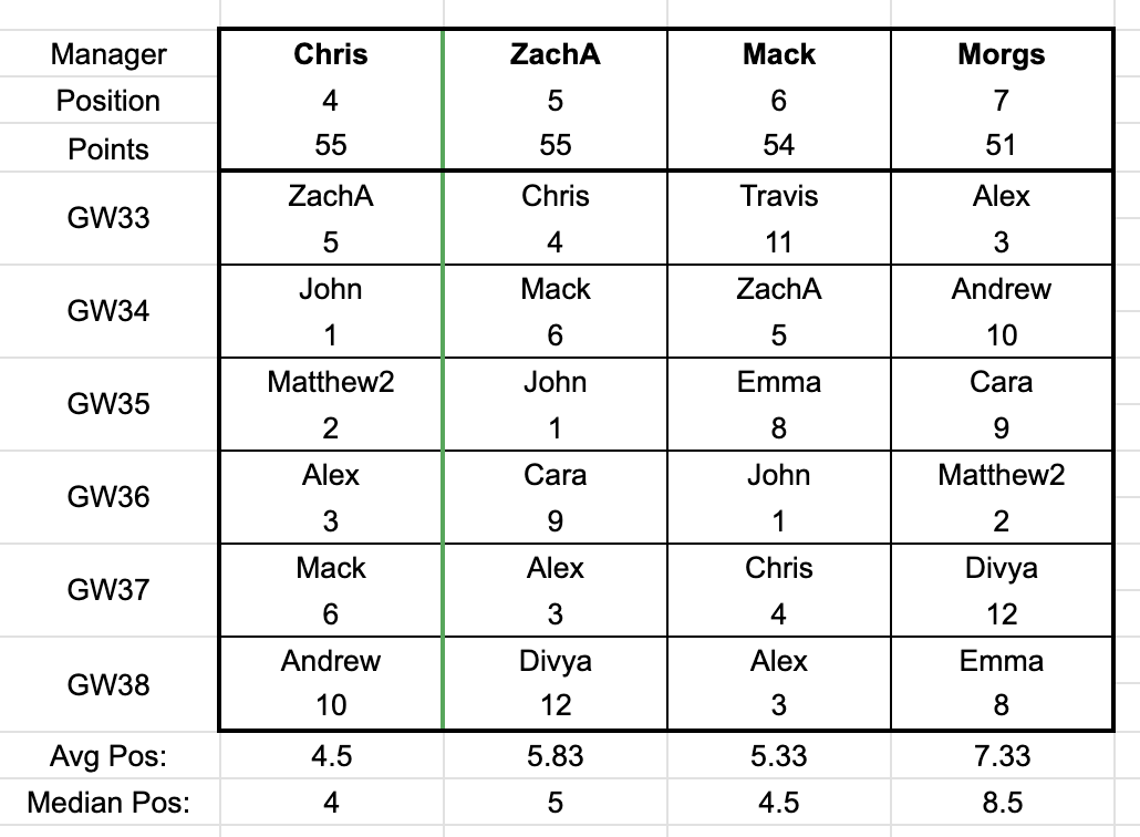 But the most drama is coming from that playoff spot in 4th place! Since my League B team is not eligible to be promoted, that means League B #4 will face off against #10 in League A for the final spot in League A next season. And currently, that race is between four managers: Chris, ZachA, Mack, and Morgs.