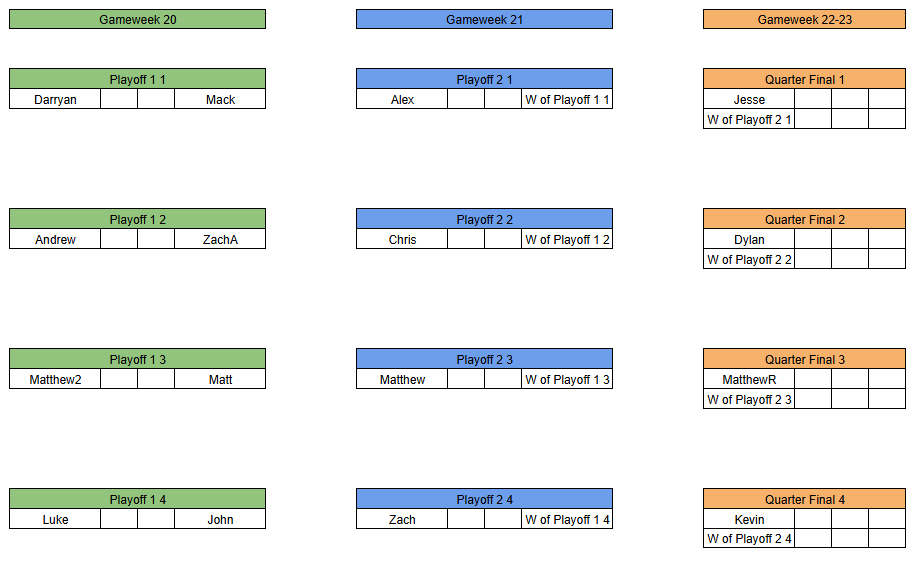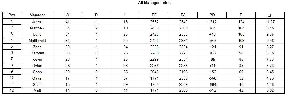 And as for the table, Jesse takes his spot alone at the top on 15 points! He is just ahead of 5 managers boasting 4 wins and battling for the automatic quarter finals spot on PF (currently): MatthewR, Kevin, Dylan, Chris, and Zach. Myself, Alex, Darryan, and Andrew are 1 win behind that group, hoping for them to drop points in the final few weeks.