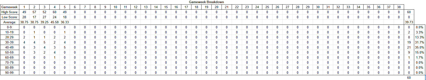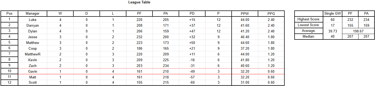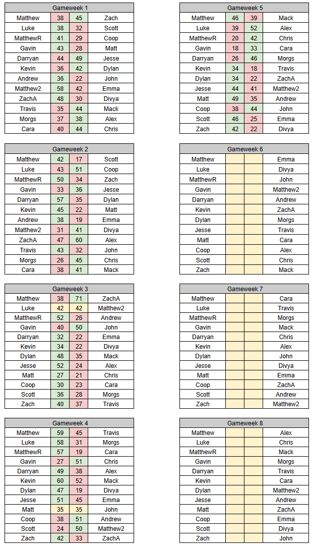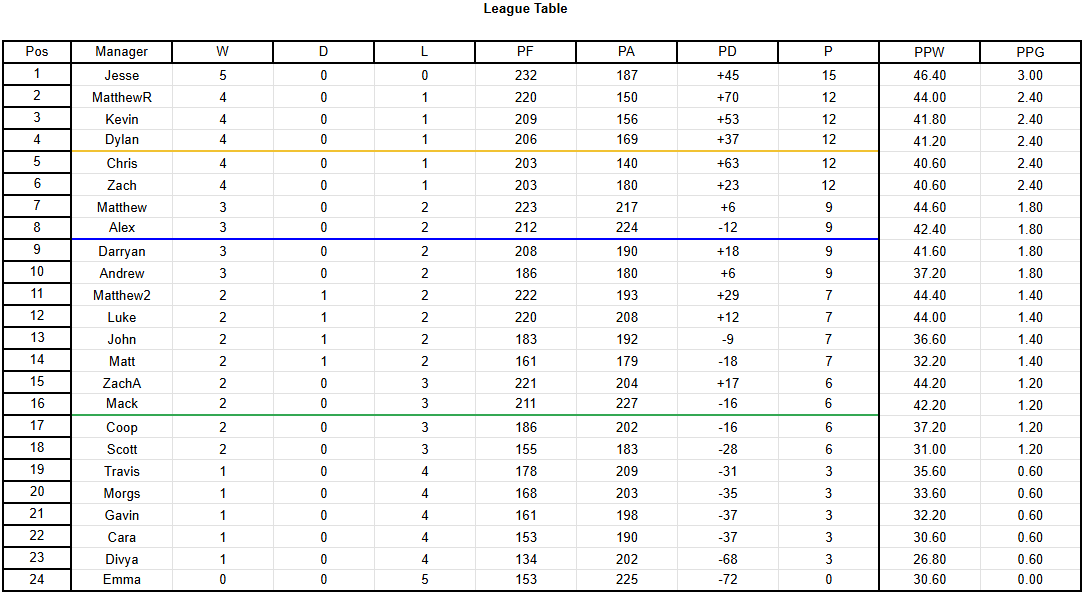 Welcome to gameweek 6 of The League(tm) group stage! With just 3 matches to go, playoff spots are still up for grabs! Highlights from this round of matchups saw League B fighting back, picking up 5 wins out of 12 (having had 3W1D last week), led by Alex's victory over Luke 52-39! Elsewhere, Jesse picked up a narrow win against my B League team 44-41, Morgs follows in my league A result's footsteps and also defeats Darryan 46-26, and John picked up some key points in a close 44-38 victory over Coop. Full results are as follows: