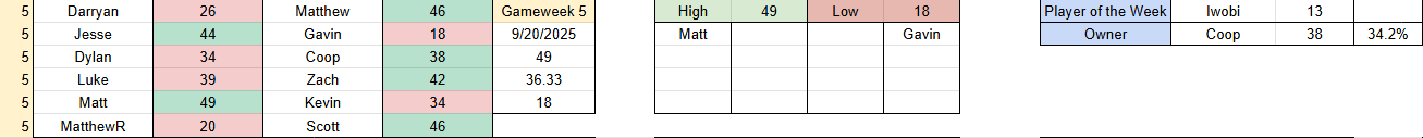 Hello everyone and welcome to gameweek 6! Waivers this week are due Friday at 3am PDT / 6am EDT! Lots of upsets and interesting results this week, led by Scott putting up his first win of the season in a 46-20 victory against MatthewR. Elsewhere, Matt picked up his first win of the season against Kevin 49-34, Darryan picked his first loss against me 26-46, Zach narrowly defeated Luke 42-39, and Coop pulled off the upset to hand Dylan his first loss with a score of 38-34. Full results are as follows: