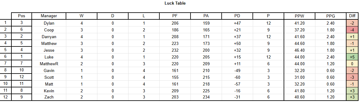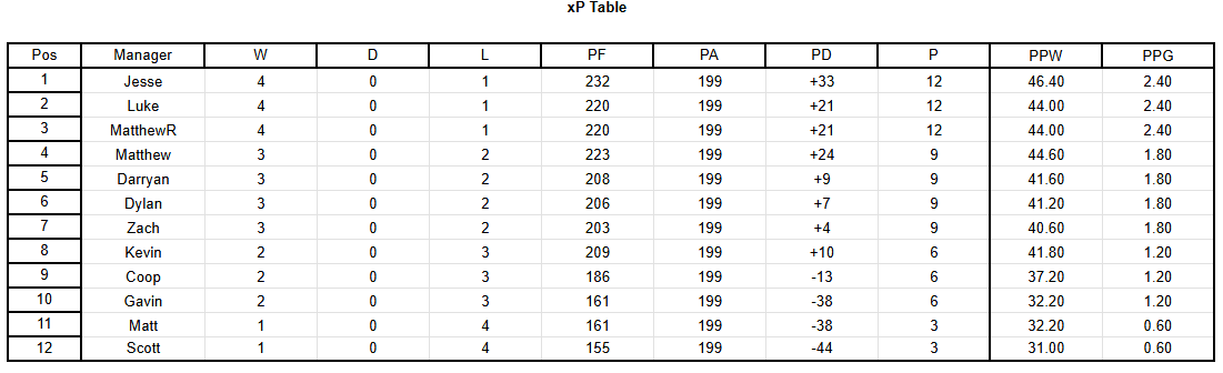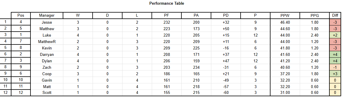 This week sees two big changes to the table: no more undefeated teams and no more winless teams! And as a result, Luke takes 1st place on PF! Just below our trifecta on 12 now sits Jesse, myself, and Coop on 9 points as our victories took us above MatthewR and Kevin.