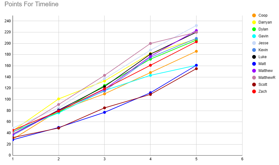Next week will have some great matchups, headlined by two teams just on the cusp of a single week bye spot in Darryan vs Andrew! Other matchups of note include a couple of League A inviters vs League B invitees in MatthewR vs John and Coop vs Alex, two teams on similar PF in Zach vs Mack, and Scott hoping to put himself back into bracket qualification in a matchup against Chris. Full matchups are as follows: