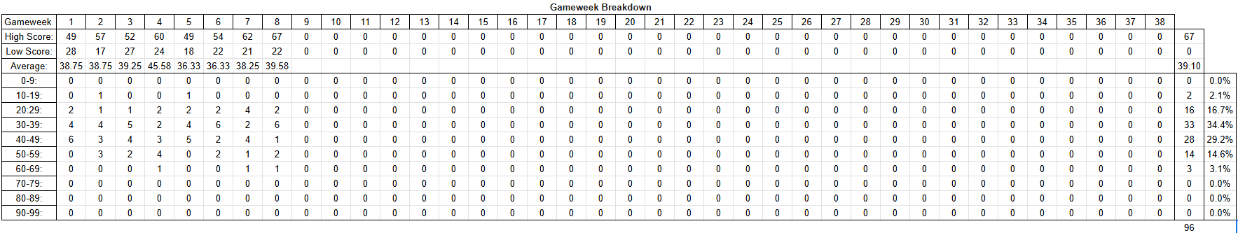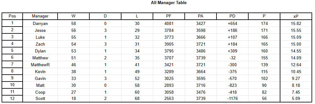 Congratulations for completing The League (tm) Group Stage! The knockout bracket is now set, and to be started in Gameweek 20! But first, let's take a look at some of our matches this week! Highlights are led by, of course, the insane 58-59 matchup between Zach and John (in which the latter won). Elsewhere, Jesse picked up a narrow 30-28 win against Andrew to secure his undefeated group stage run, ZachA defeated Matt 40-37, Morgs fended off Gavin in a high scoring 46-39 match, and I picked up a 43-37 win against Alex. Full results are as follows: