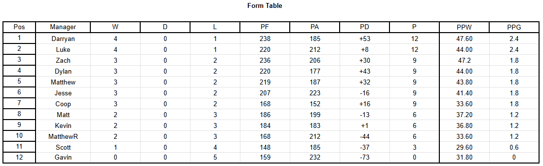 In terms of form, Darryan and Luke sit atop the table with 12/15 points earned! Just ahead of a group of 5 on 9/15 points.