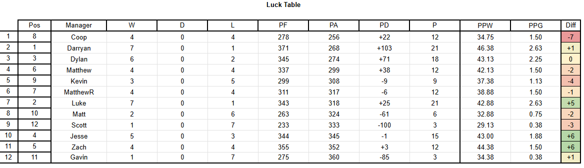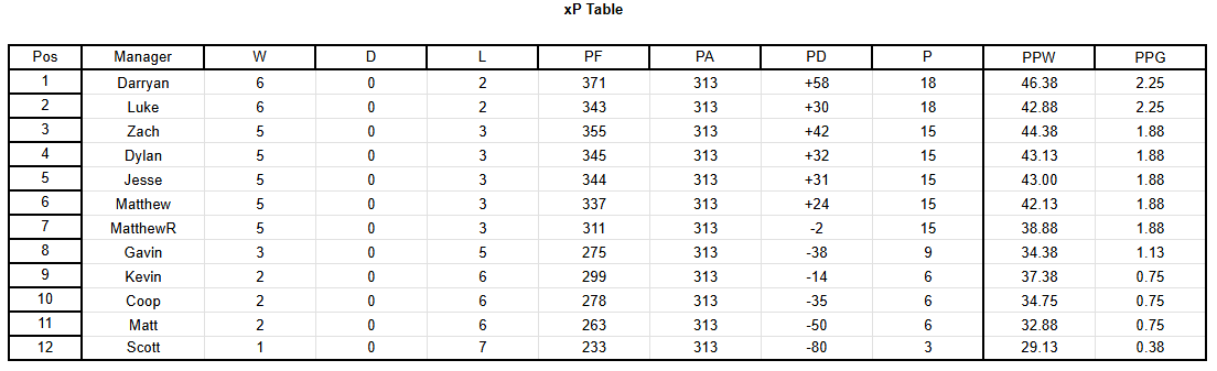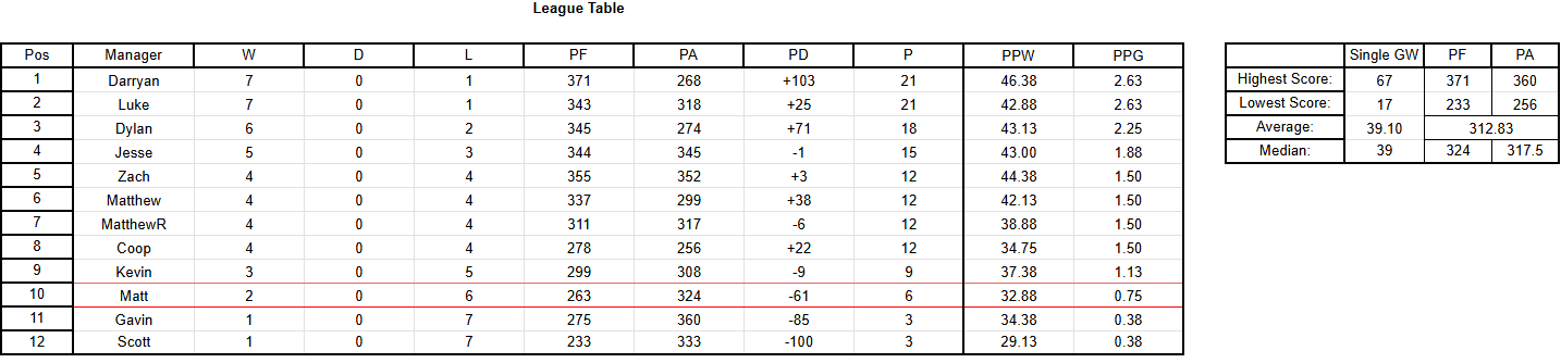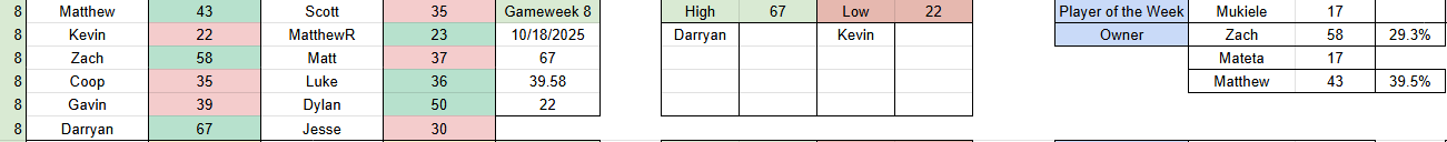Hello everyone and welcome to gameweek 9! Waivers this week are due Thursday at 10:30am PDT / 1:30pm EDT! Highlights from this week include the absolute barn-burner between MatthewR and Kevin where the former took the match by a score of 23-22! Elsewhere, Luke took another close win 36-35 against Coop and Darryan put up a season-high 67 pointer against Jesse's 30. Full results are as follows: