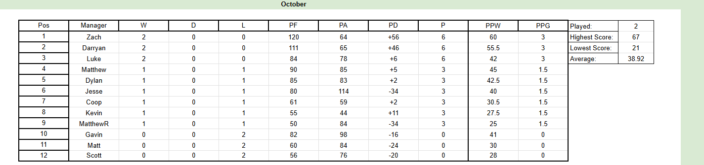 After the second gameweek of October, Zach has a narrow lead with 120 PF! Darryan and Luke are the only other 2 unbeaten teams!