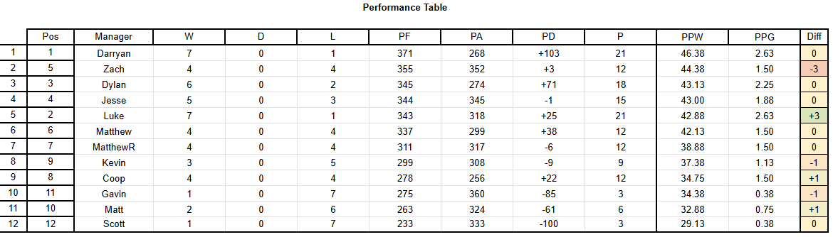 This week sees Darryan stake his claim on top once again on PF ahead of Luke! Dylan's win takes him into sole position of 3rd over Jesse. Just behind him on 12 points sits Zach, myself, MatthewR, and Coop.