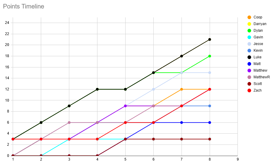 And as for the table, congratulations to Jesse for being the group stage champion! He put together an impressive 8-0-0 performance to pick up a maximum 24/24 points! He has qualified directly to the quarter finals, along with Zach, Dylan, and myself. This means that Chris and Kevin, who were both in the top 4 at the start of the week, have earned a single week playoff bye instead. They are joined by Luke and Darryan, who round out the top 8. Darryan actually knocks MatthewR out into 9th with his loss this week, so he will play in the first playoff round and is joined by John, ZachA, Mack, Alex, Andrew, Matthew2, and Matt.