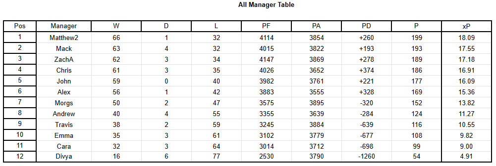 This week will see some great matchups, headlined by a big matchup in the race to catch the top 3 between Morgs and John! Elsewhere, Travis looks to bounce back against Chris, I take on Cara, and Divya faces off against Mack! Full matchups are as follows: