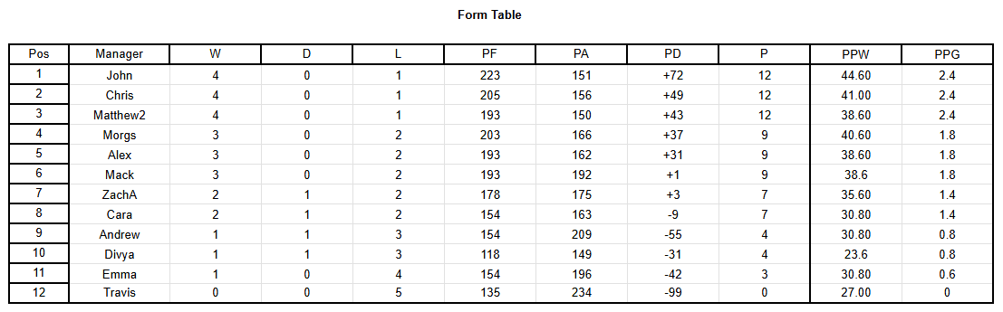In terms of form, John takes the top spot on PF! He is joined by Chris and myself on 12/15 points earned over the last 5 weeks!