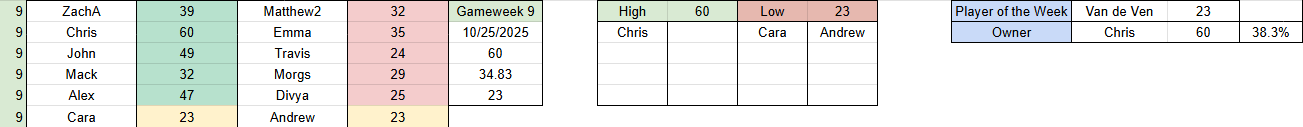Hello everyone and welcome to gameweek 10! Waivers this week are due Friday at 6:30am PDT / 9:30am EDT! Highlights from this week are led by our second tie of the season, this time between Cara and Andrew at 23-all! Elsewhere, Mack picked up a close victory over Morgs in the Henderson derby, ZachA defeated me by a score of 39-32, and Chris put up a week-high 60 points against Emma's 35. Full results are as follows: