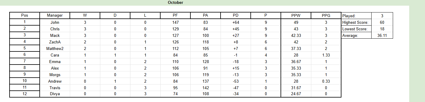 Congratulations to John for winning October Manager of the Month! He took it on PF over Chris and Mack, who also went undefeated!
