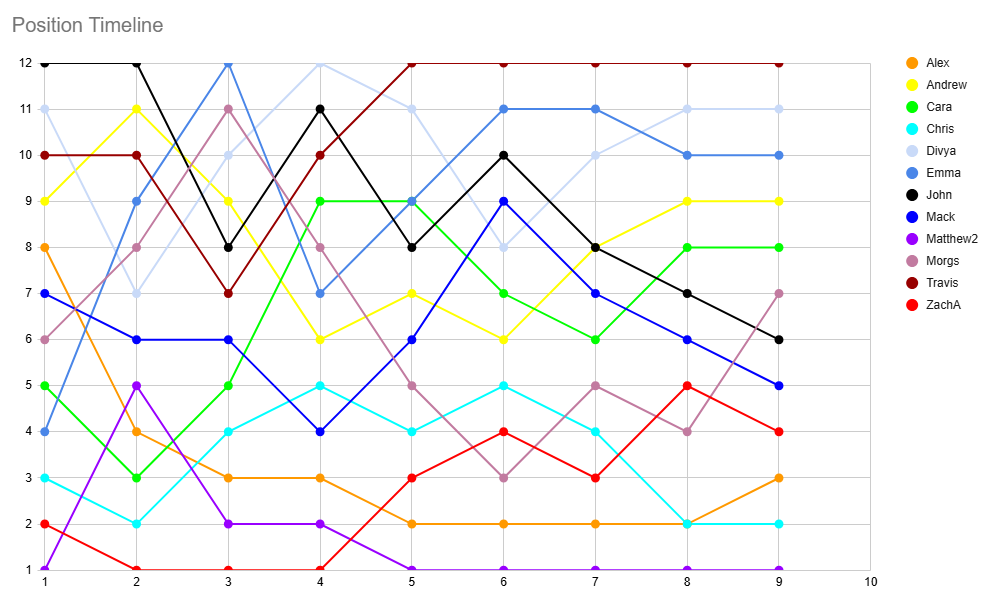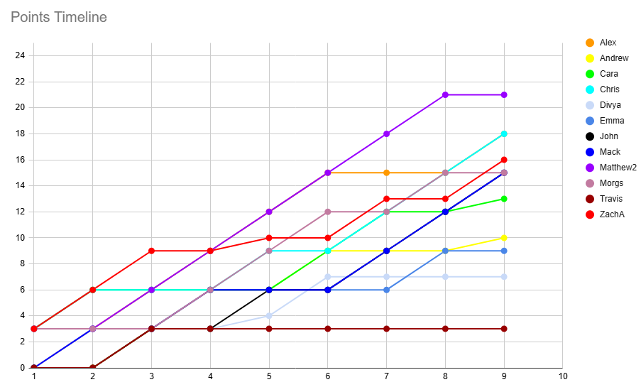 Looking at the table, we see Chris and Alex cut my lead to just 3 points this week, with Chris passing the latter on PF for 2nd. ZachA, Mack, and John also find themselves moving up the table, just 2, 3, and 3 points behind Alex. The trio moves ahead of Morgs on PF. The rest of the table remains the same, with Cara and Andrew's draw seeing them remain a consistent 3 points apart.