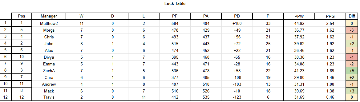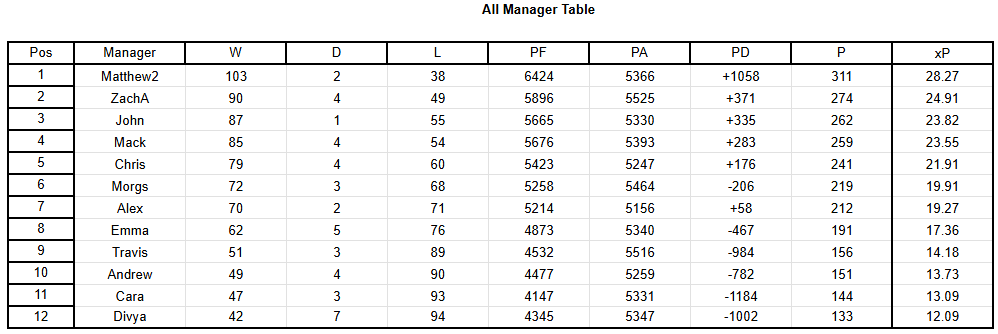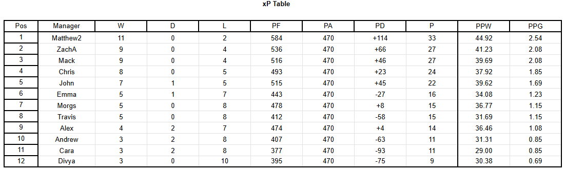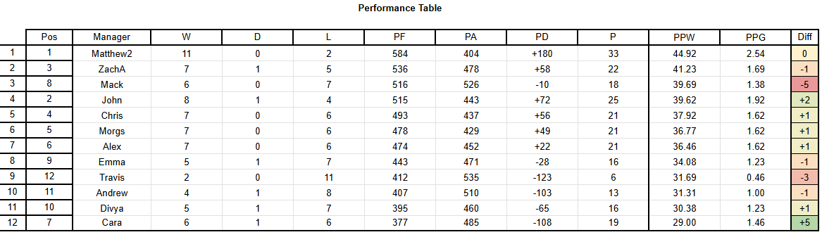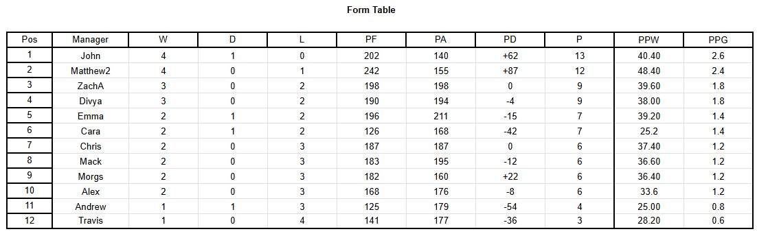 In terms of form, John of course takes the top spot with 13/15 points earned! And I am the only manager on 12/15!