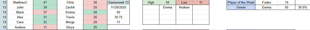 Hello everyone and welcome to Gameweek 14! This week had a quick turnaround since we have games tomorrow, so waivers were due this morning and free agency is open! Highlights from this week include Emma putting up 50 points to Mack's 37, John defeating ZachA 39-25, and Cara upsetting Morgs 32-20. Full results are as follows: