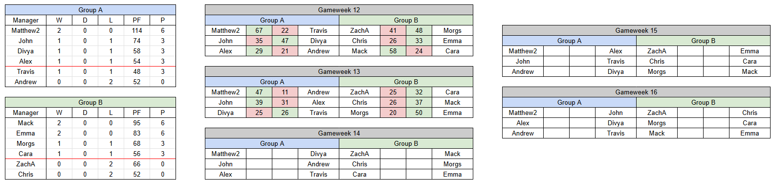 Next week will see some great matchups, headlined by two (nearly) must-win matches in Group B in ZachA vs Mack and Chris vs Morgs as the first of each match is staring down an 0-3 start to the group stage should they lose this week. In Group A the matchup to watch will be Alex vs Travis, with both managers on 3 points and looking to make their position that much safer on 6. Full matchups are as follows: