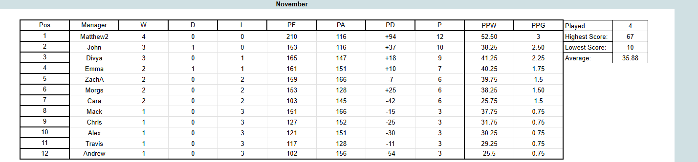 Congrats to John for winning November Manager of the Month (as I am ineligible)! That makes it back to back wins!