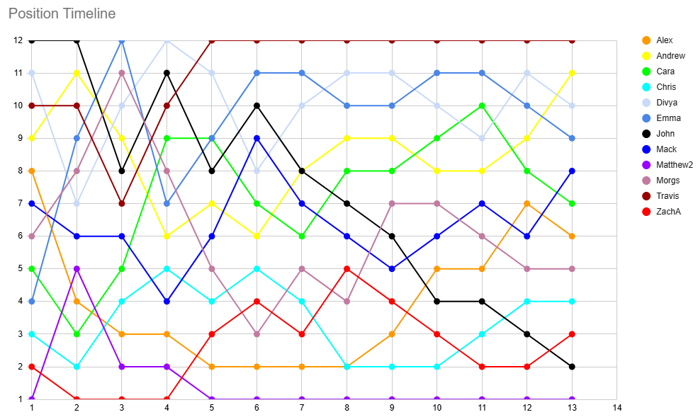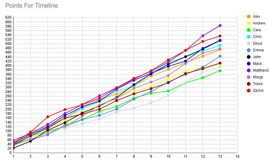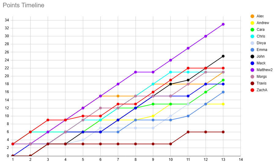 Looking at the table, my lead stays at 8 points as John's victory takes him into 2nd over ZachA. Just 1 point behind Zach sits Chris and Morgan (still), who have been newly joined by Alex. Cara's win sees her move just 2 points behind the trio, ahead of Mack by 1 point. Just below sit Emma and Divya, whose wins took them above Andrew this week.