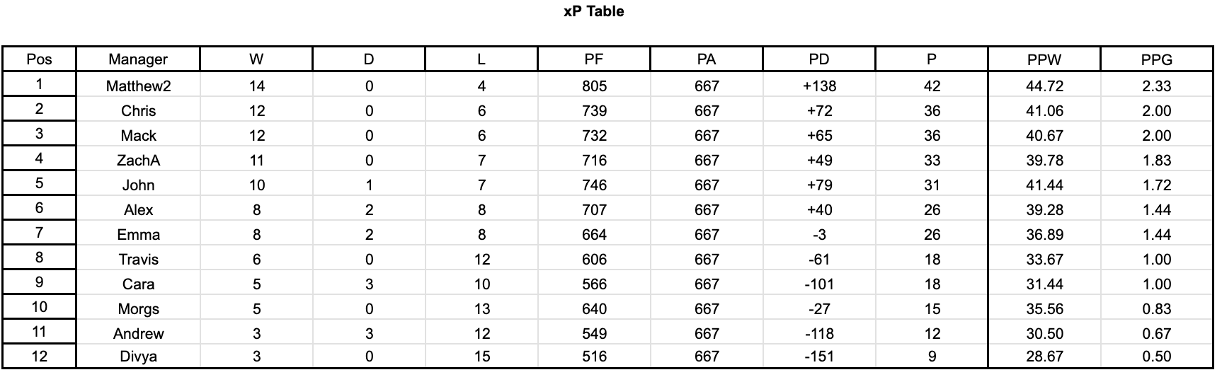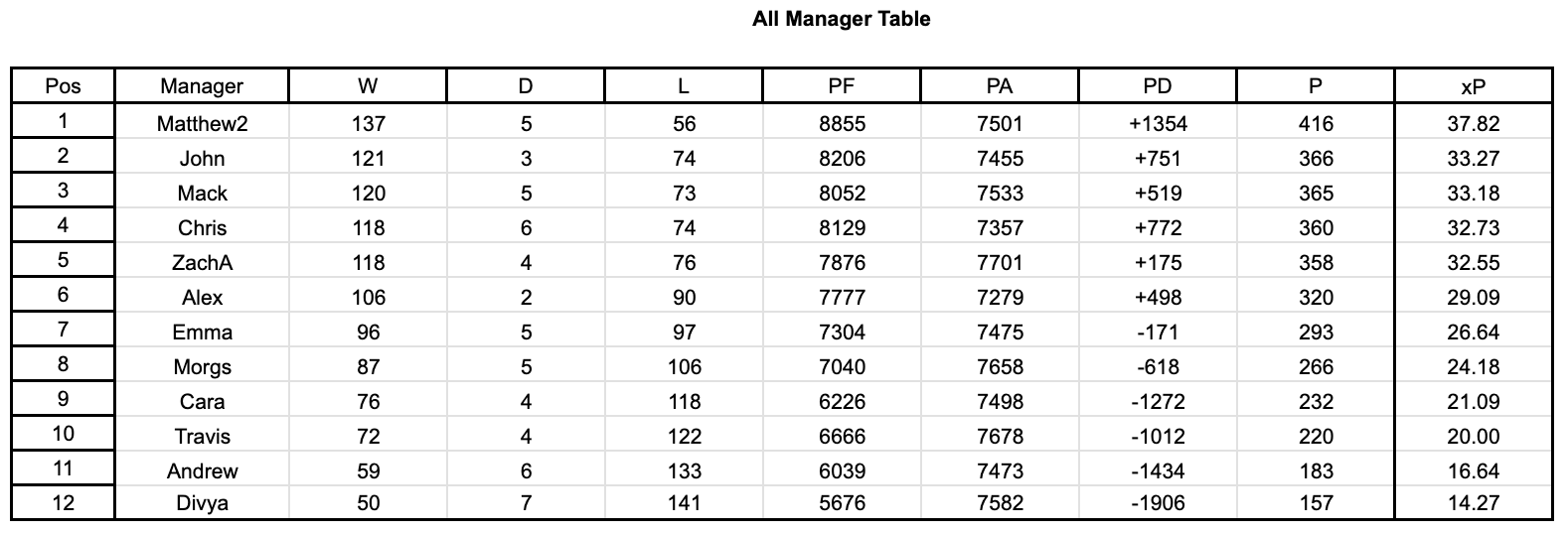 xP Table (manager vs average)