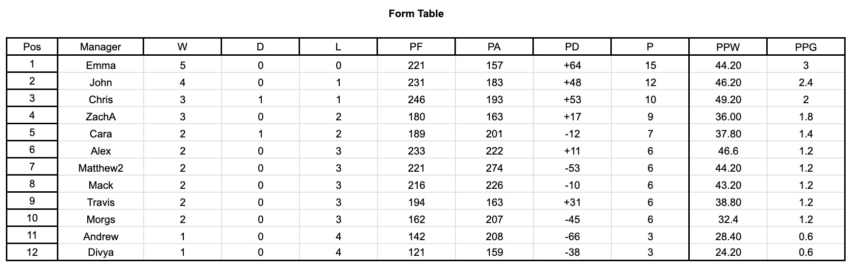 The form table is, of course, the same as the Manager of the Month table this week. So I won't write anything else about it. Here it is though: