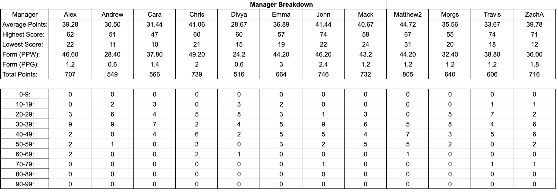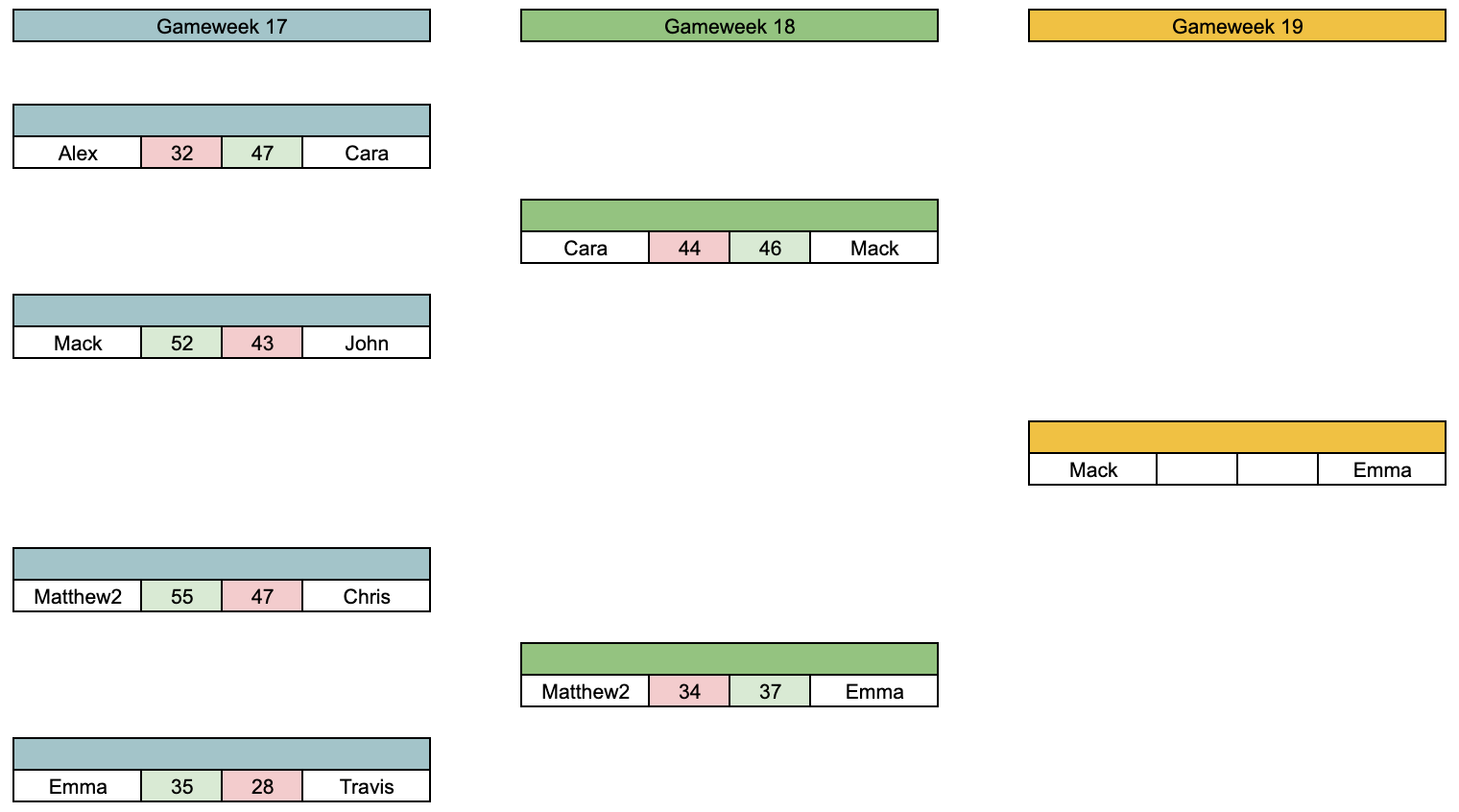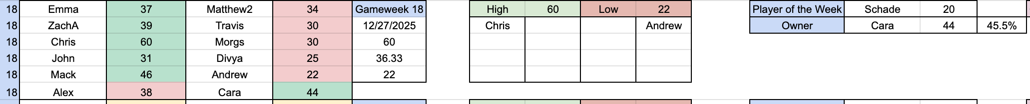 Hello everyone and welcome to gameweek 19! Waivers this week were due this morning (probably, I'm currently writing this on an airplane so I honestly am not sure when this will be sent out) since there are games tomorrow! Highlights from this week include a 37-34 upset from Emma as she hands me my 3rd defeat in the last 4 weeks, Chris put up a week high 60 points against Morgs' 30, and Cara took a close match against Alex 44-38! Full results are as follows: