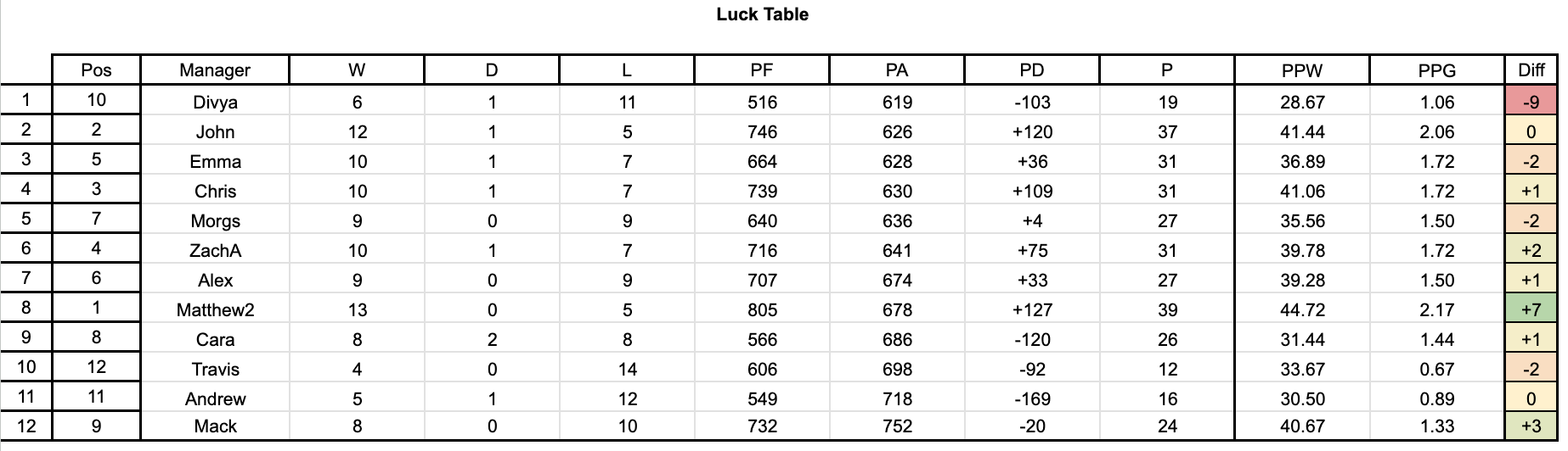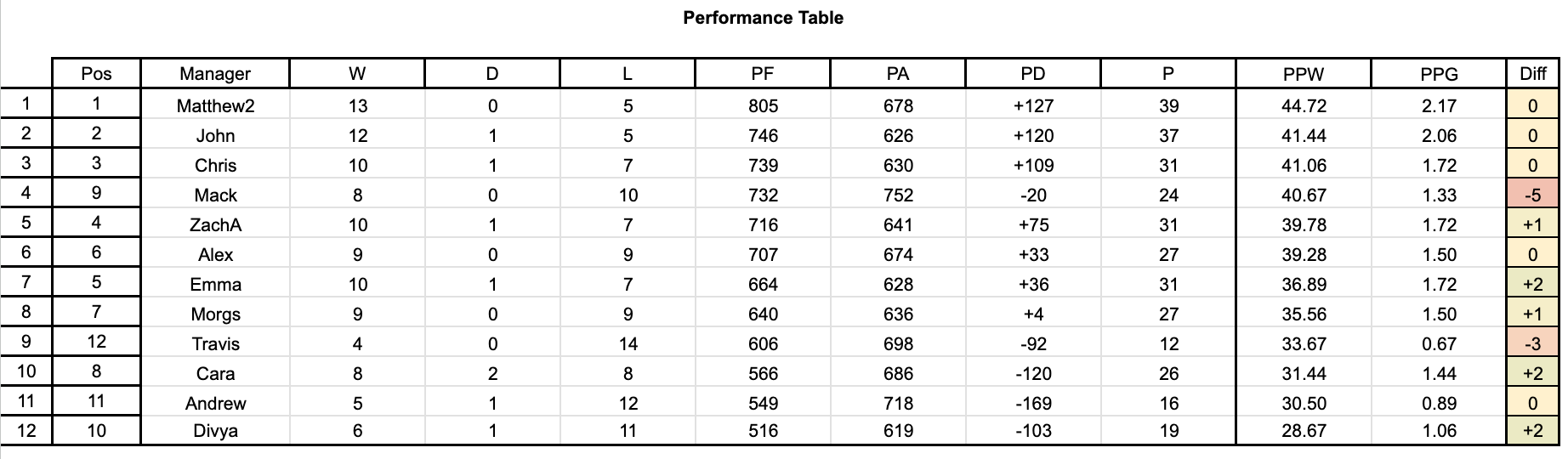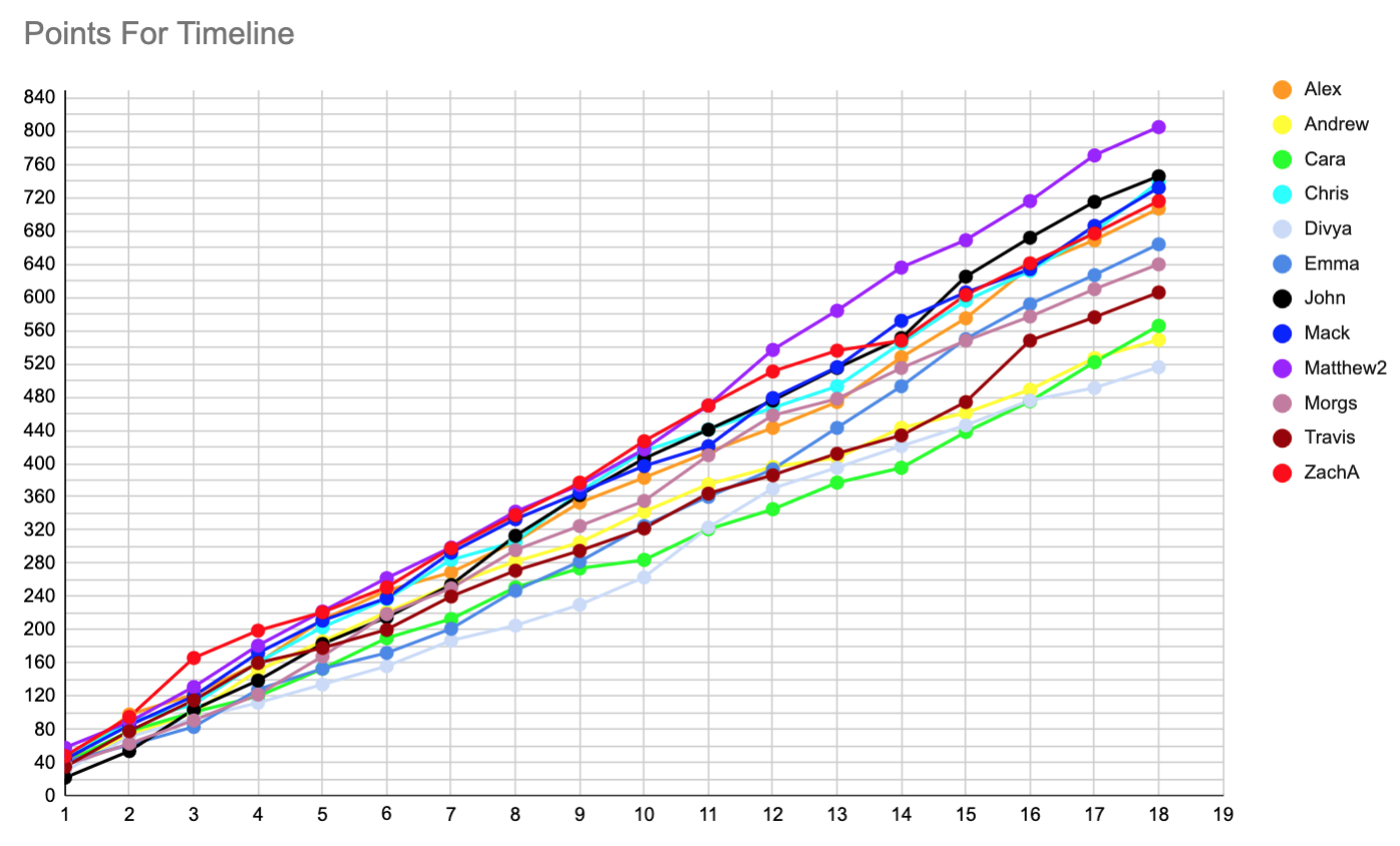 Taking a look at the table, a rare week with no movement, but lots of gaps being closed across the table, starting at the top as my lead has fallen to just 2 points over John! Behind him by 6 points are the trio of Chris, ZachA, and Emma. They currently have a 4 point gap above Alex, who is only above Morgs on PF. They are being chased by Cara, who is only back by 1 now, and Mack, who is another 2 behind her.