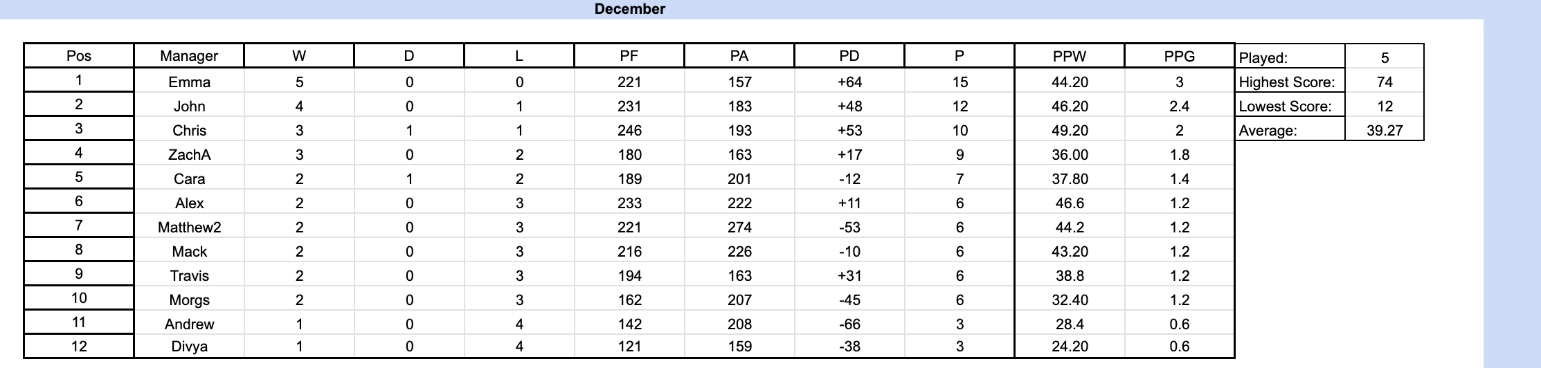 Going into the final gameweek of December, Emma keeps her spot at the top of the table! At this point, only John at 12 points can catch her (should she lose this week).