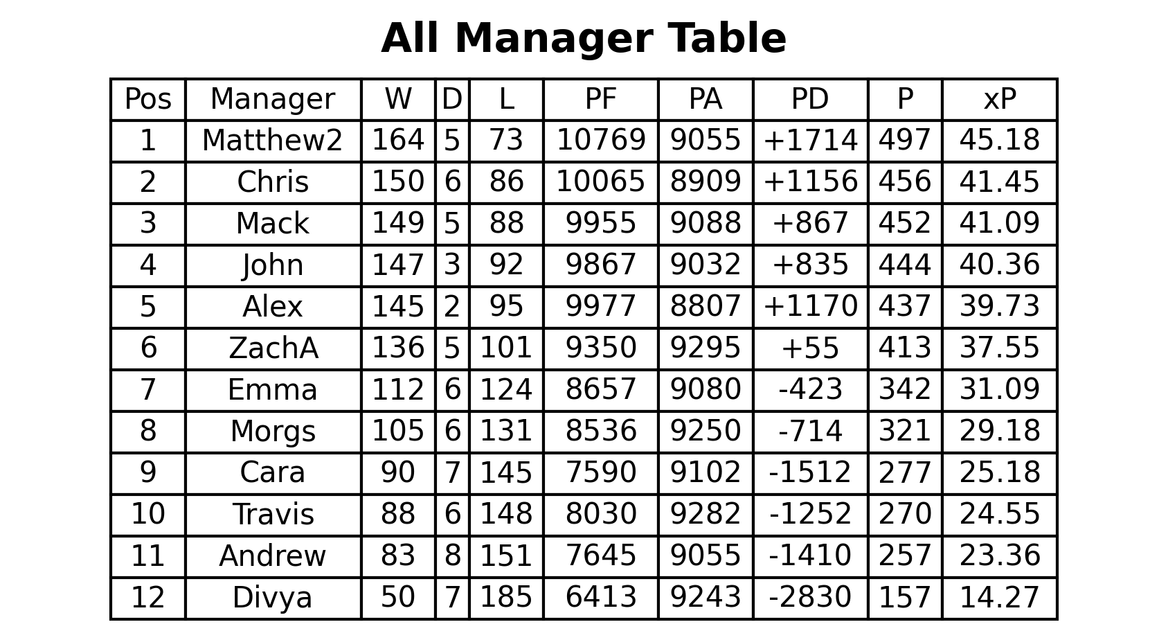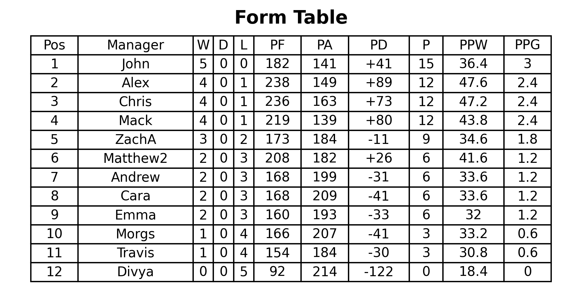 In terms of form, John keeps it going at the top with his 15/15 points earned! He sits above Alex, Chris, and Mack who all have picked up 12 out of the last 15 available points!