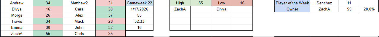 Hello everyone and welcome to gameweek 23! Regular week this week so waivers are due Friday at 3am PST / 6am EST! Highlights this week include a big upset as Andrew beat me by a score of 34-31! Elsewhere, Travis took home 3 points in a win against Mack 34-28, John narrowly defeated Emma 32-30, and ZachA put up a week high 55 points to defeat Chris's 35. Full results are as follows: