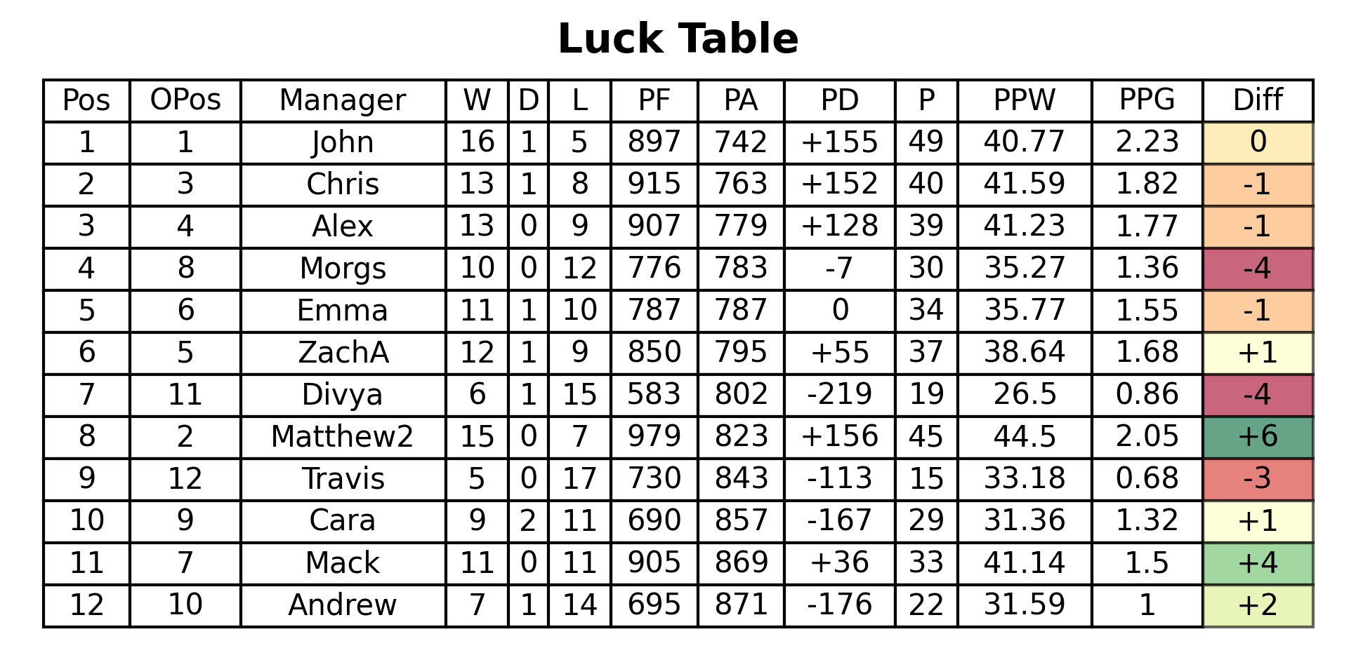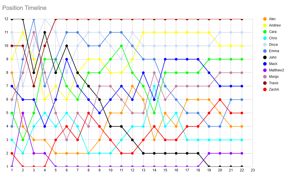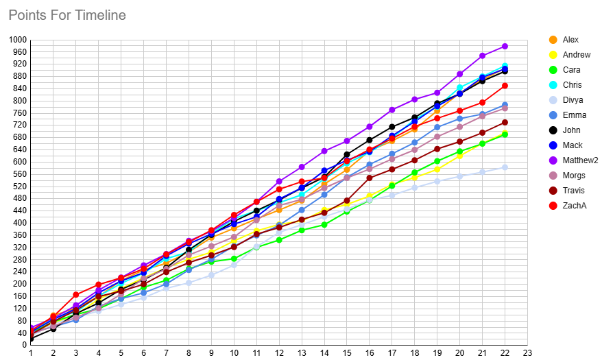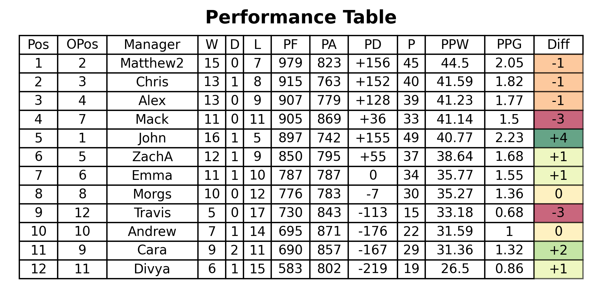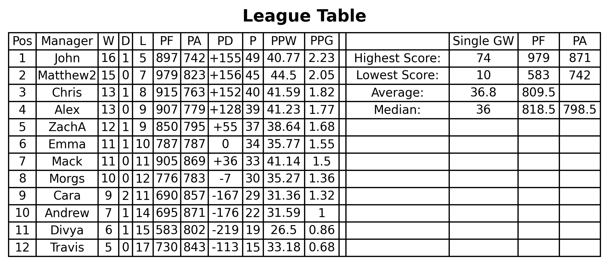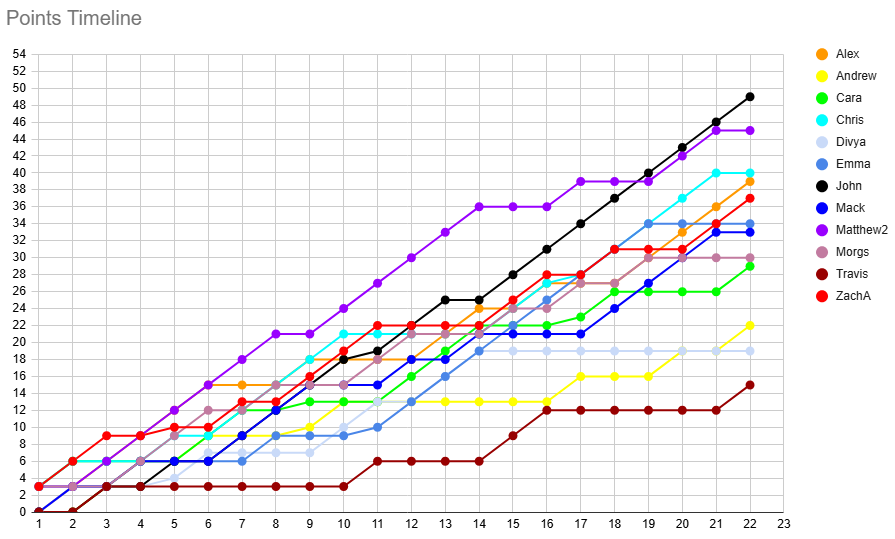 And in a week opposite of League A, nobody has moved on the table! Some notable movement points-wise includes John extending his lead at the top to 5 points, Alex cutting the gap between him and Chris to just a single point, with Zach 2 points behind him, and Cara moving to just 1 point behind Morgs!