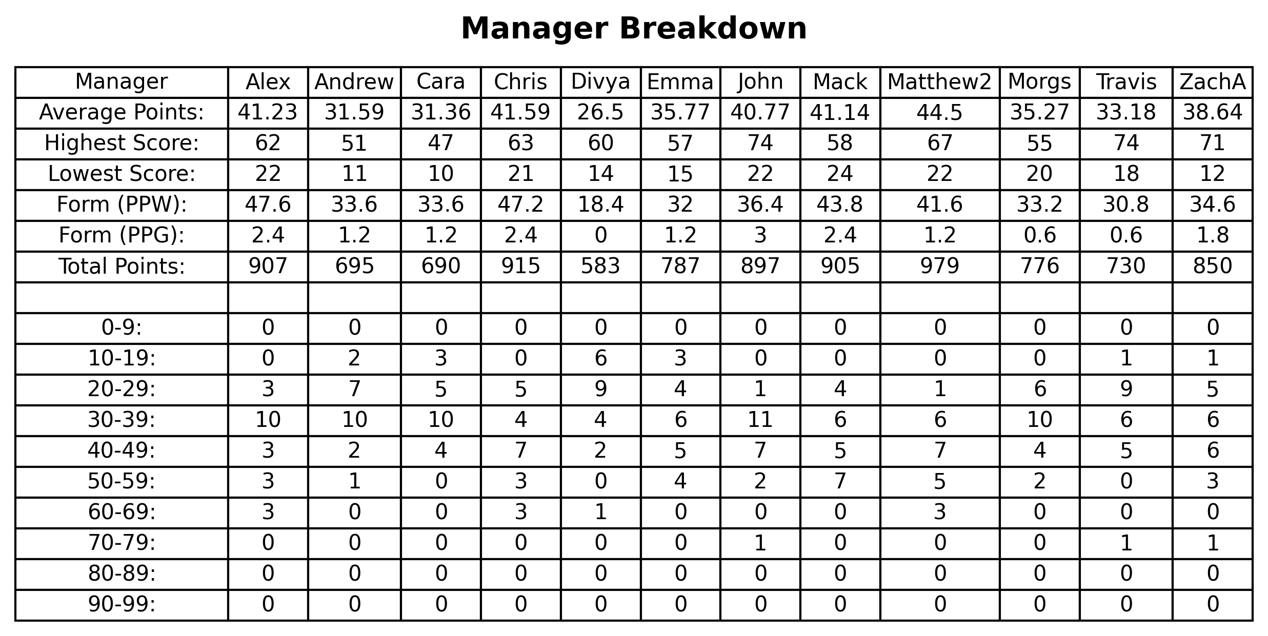 1 - Darryan (-) - League A - Last 5: 40 (W), 42 (L), 43 (D), 58 (W), 36 (L) - Another week where a slightly different bench choice would've resulted in a Darryan win (he lost by 1 point and had a 3 and 4 on the bench). I'm sure he'll be fine though, Haaland should get a rest soon which will only help him in the long run, Romero is the only player who can score goals on Spurs, and double Arsenal defence can't be beat. But also, 1 goal in the last 5 weeks from the robot is rough.