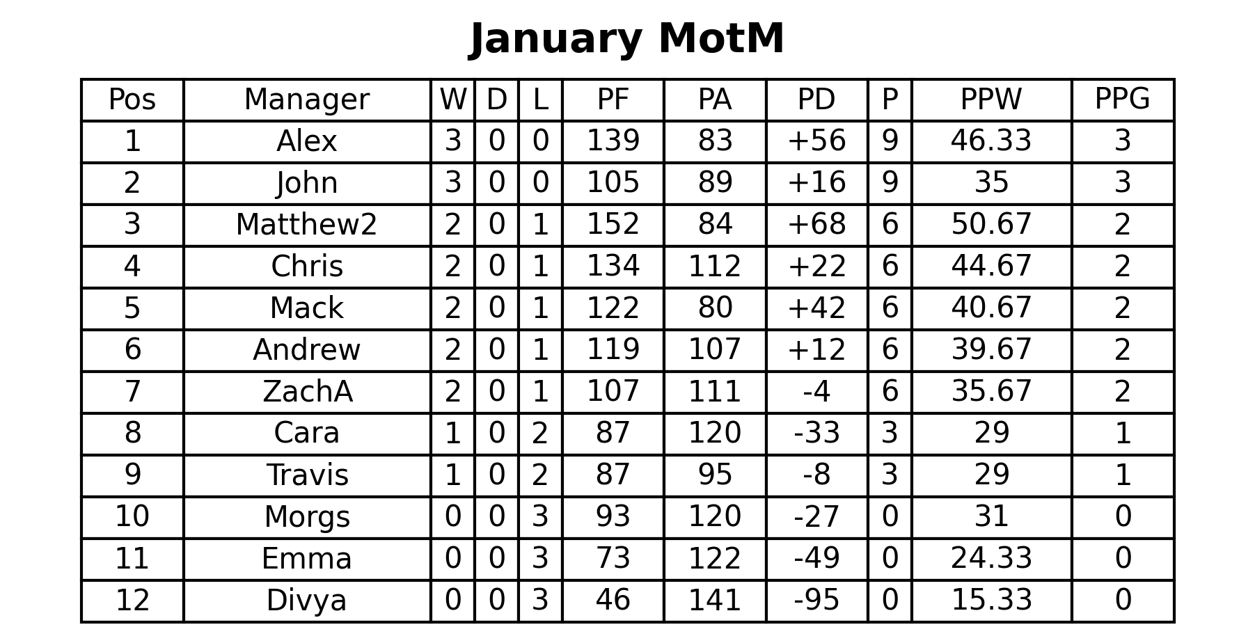 60% of the way through January and Alex and John are the only two undefeated managers remaining! They lead a whole bunch of managers on 6 points with 2 gameweeks left!