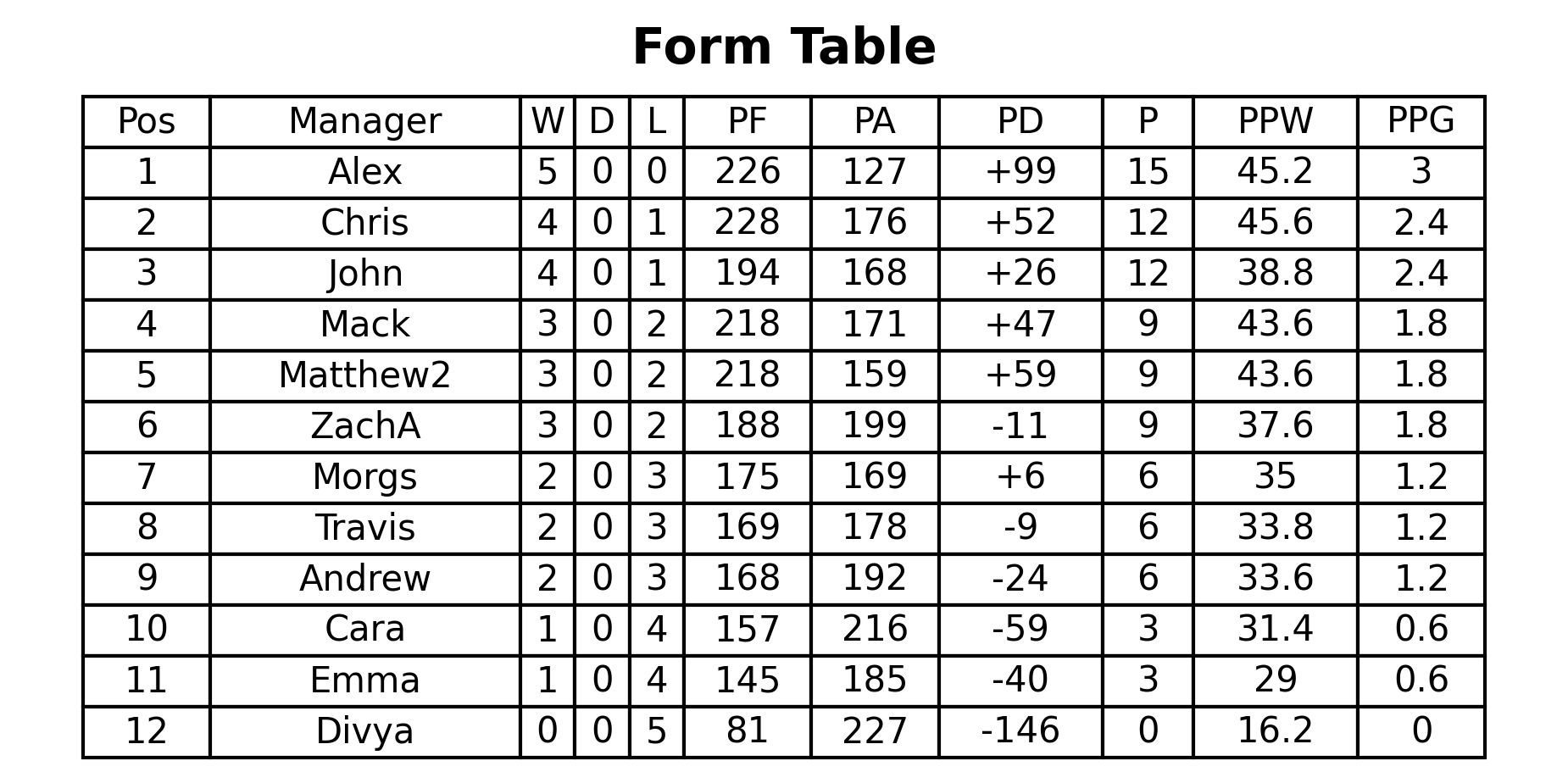 And, of course, Alex also sits atop the form table with 15/15 points earned! Chris and John are just behind with an impressive 12/15 points in the past 5 weeks!