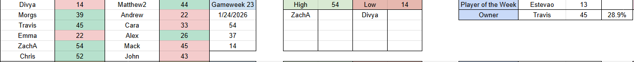 Hello everyone and welcome to gameweek 24! Another normal week with waivers due at 5:30am PST / 8:30am EST! Some great matchups this week, headlined by Mack's brutal defeat to ZachA 45-54. Elsewhere, Chris took a similar devastating win against John 52-43, Alex defeated Emma by a narrow score of 26-22, and Travis picked up all 3 points against Cara 45-33. Full results are as follows: