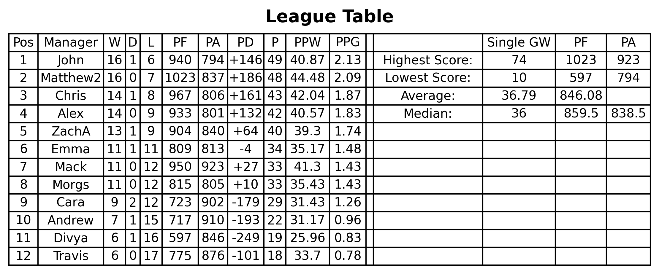 This week will see some great matchups, headlined by a top 3 matchup between me and Chris! Elsewhere, John takes on ZachA in what should be a fun one, Mack faces off against Emma, and Andrew and Divya go up against each other in a Gribbins derby! Full matchups are as follows: