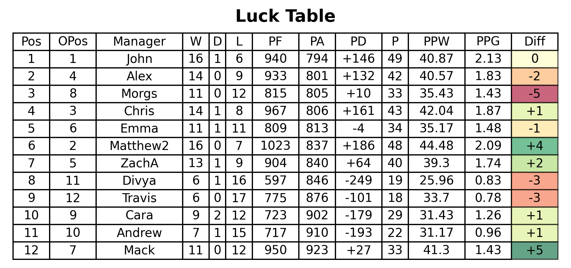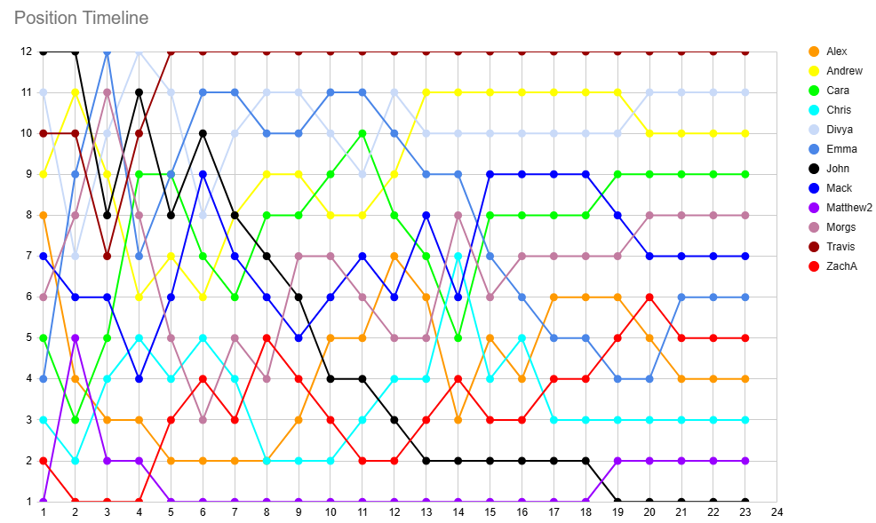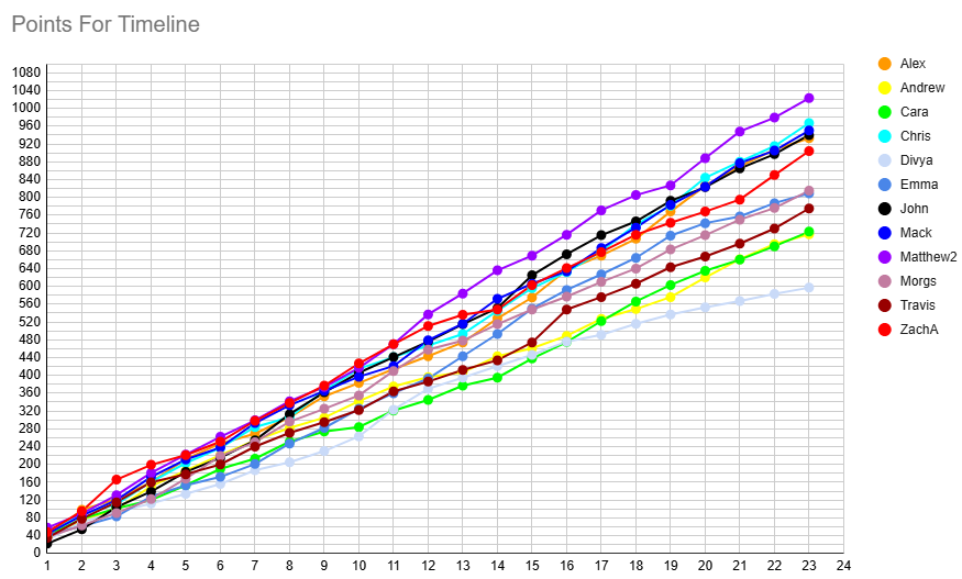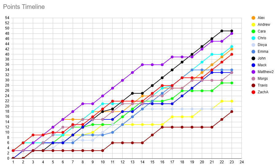 Taking a look over at the table, once again nobody has moved. However, John's lead in 1st over me is cut to just 1 point, with Chris, Alex, and ZachA all picking up wins and extending the gap of the top 5 to 6 points over Emma. She remains just 1 point ahead of Mack, who is now joined by Morgs on 33 points. Further down, Travis's win sees his gap with Divya go down to just a single point as well!