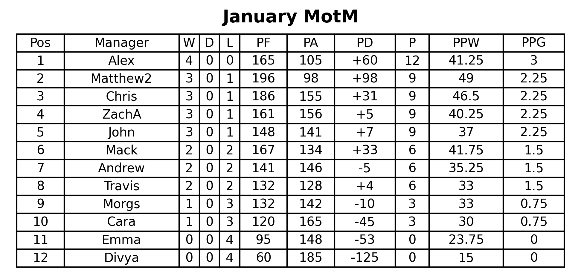 With just 1 week left in January, Alex takes the top spot on the manager of the month table with 12 points! He is ahead of me, Chris, ZachA, and John, who will all be routing against him this week!