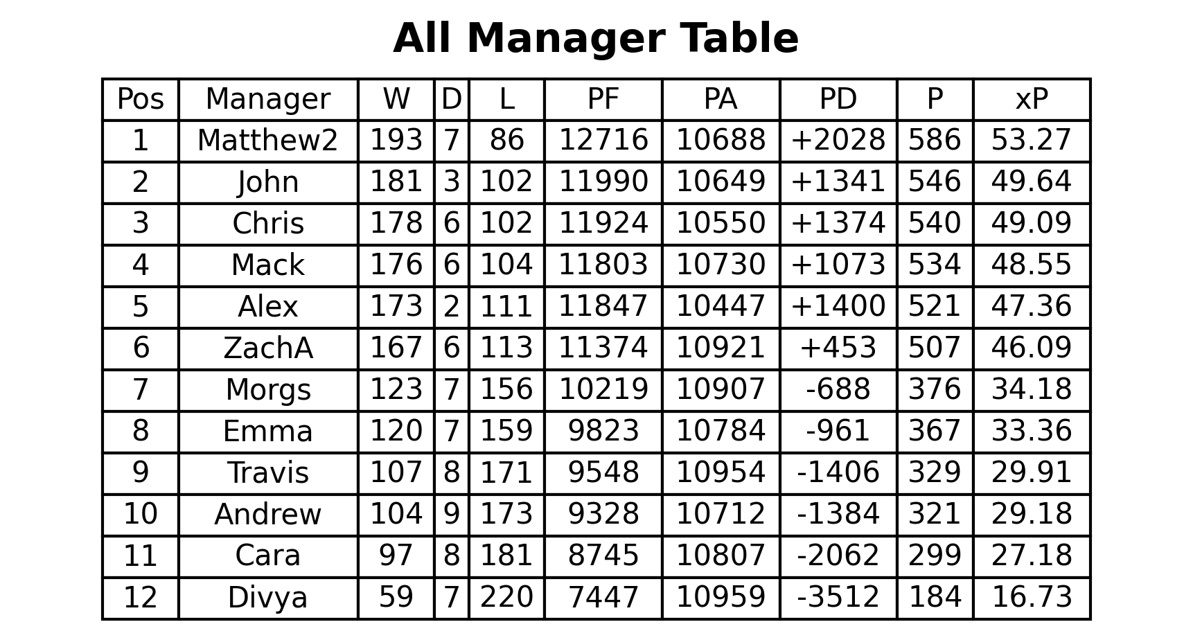 1 - Matthew2 (-) - League B - Last 5: 31 (L), 44 (W), 49 (W), 45 (W), 39 (L) - Not a bad week but also the team decided they didn't want to clutch up for the match against John. Hill I guess did something, but 3 5/6 pointers in midfield and a 4 pointer from a DGW 180' just wasn't enough. Good attempt Wolves lads o7.