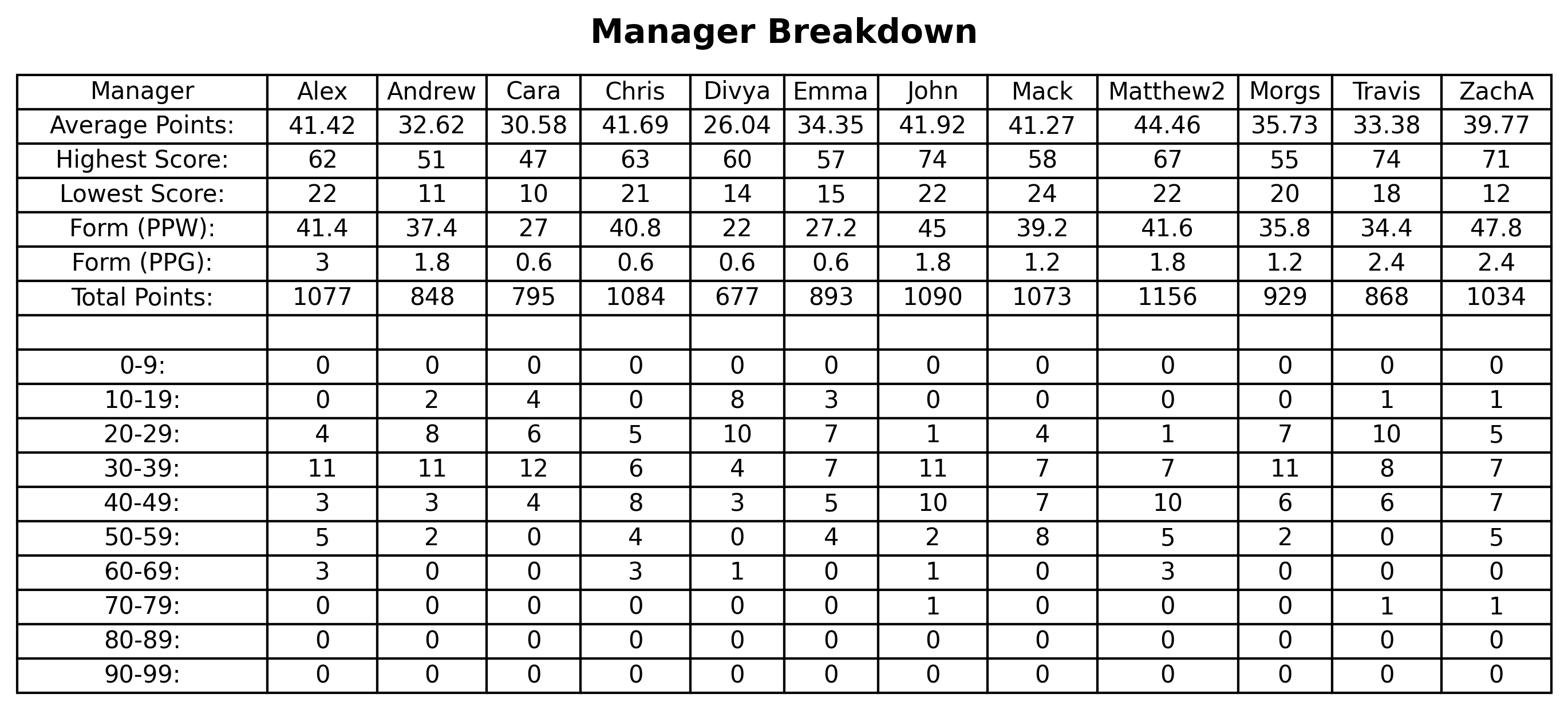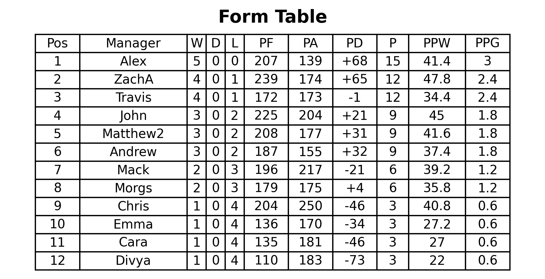 Taking a look at the form table, Alex keeps his undefeated streak alive as he is now the only manager with 15/15 points earned in the last 5 weeks! ZachA and Travis are the only 2 on 12/15!
