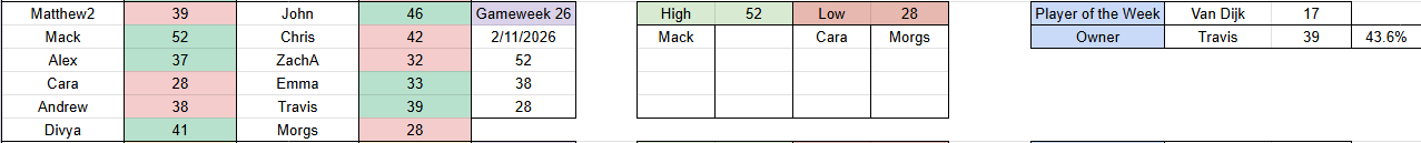 Hello everyone and welcome to gameweek 27! Waivers this week are due tomorrow morning at 5:30am PST / 8:30am EST! Some great matchups across the board this week, led by a single point victory by Travis over Andrew! Elsewhere, close victories by Emma with her 33-28 match against Cara and Alex with his 37-32 win over ZachA. Plus, John picked up a huge win this week 46-39 against my League B team! Full results are as follows: