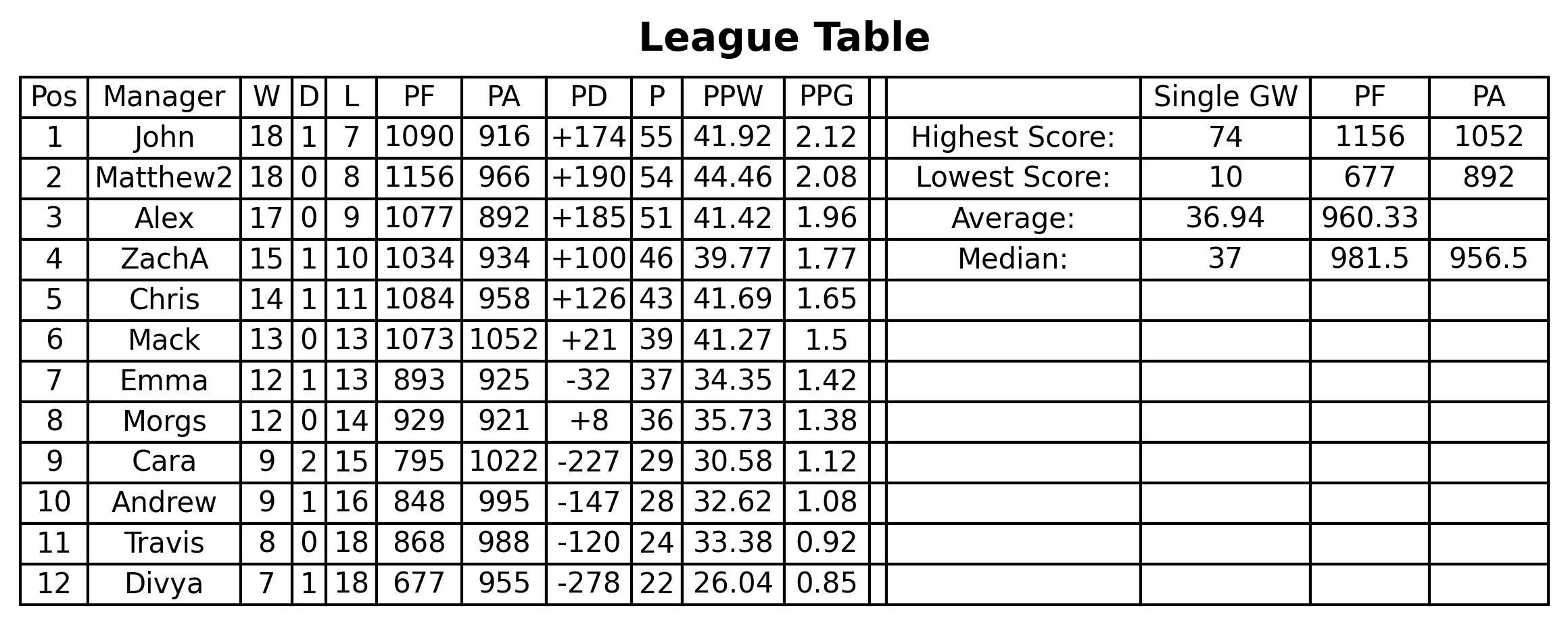This week will see some great matchups, headlined by what should be a great matchup between Mack and Alex! Elsewhere, I take on Travis's in-form team and Emma goes up against Morgs! Full matchups are as follows: