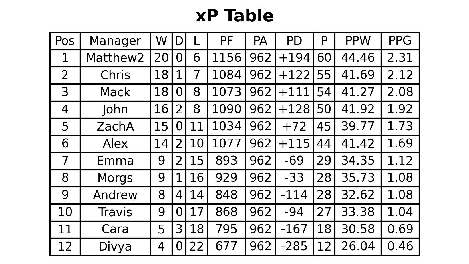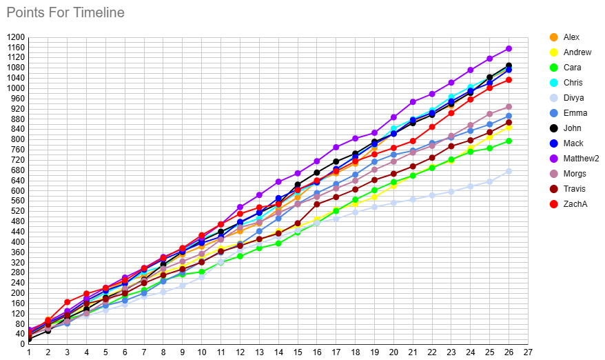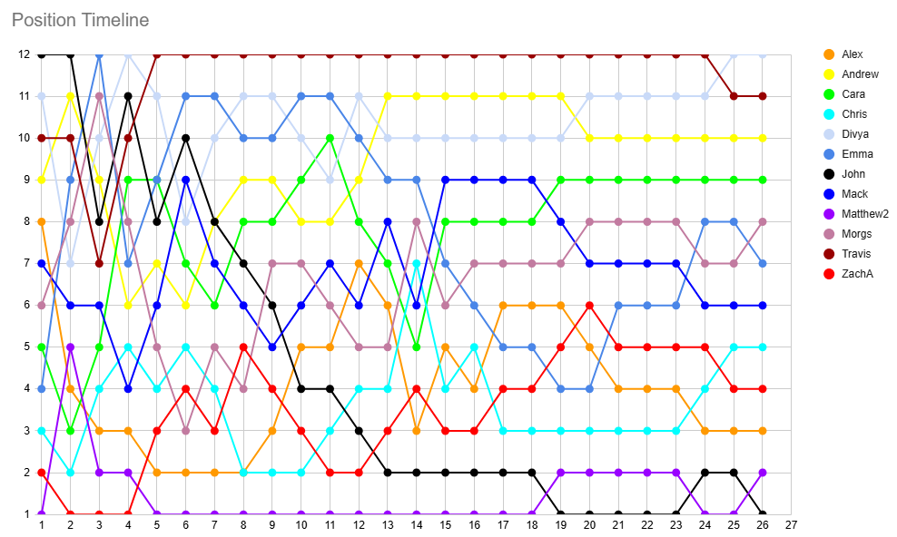 Some hugely consequential results across the table, where starting at the top we have our 5th change at the top of the table as John now holds a 1 point lead over me! Alex's win sees him close the gap on 2nd to 3 points, now 5 points ahead of ZachA! Chris sits 3 behind him, with Mack pulling a bit closer, now just 4 points off the top 5. Emma's win also sees her move up the board, passing Morgs by a point, now just 2 behind Mack. Further down, Travis moves to 4 points behind Andrew, with Divya keeping pace 2 points behind him.