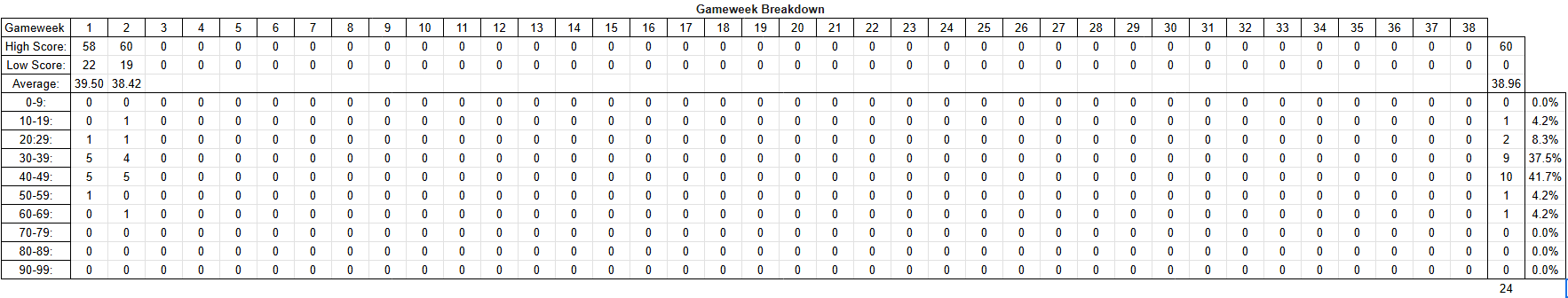 10 - Alex (NEW) - League B - Alex's 60 point showing (highest score from both leagues) this week forced my hand to sneak him in at #10. That said, the score was off the back of a rare Pickford pen save, 2 assists from Calafiori, and a Gravenberch goal, so while the score was solid, I want to see some more consistency before he moves higher.