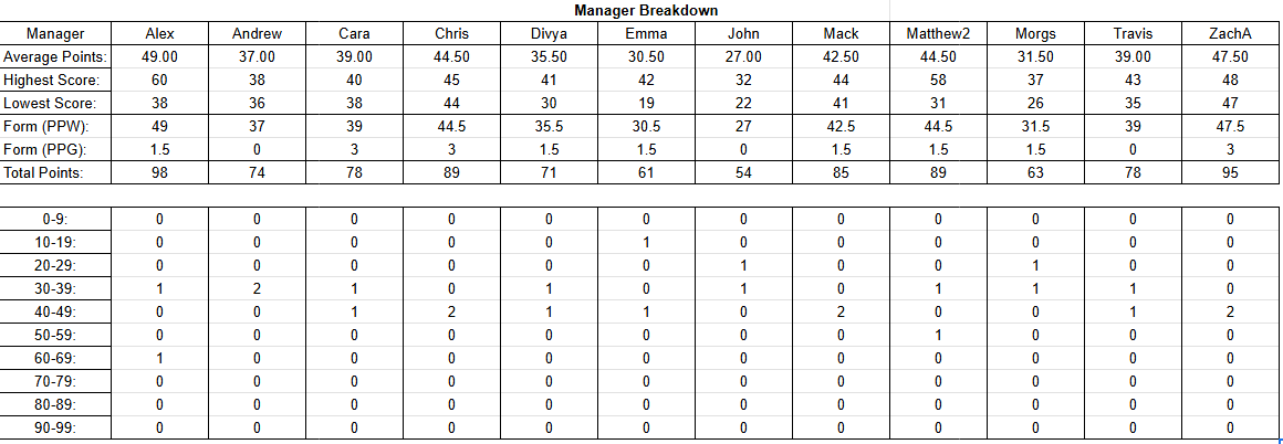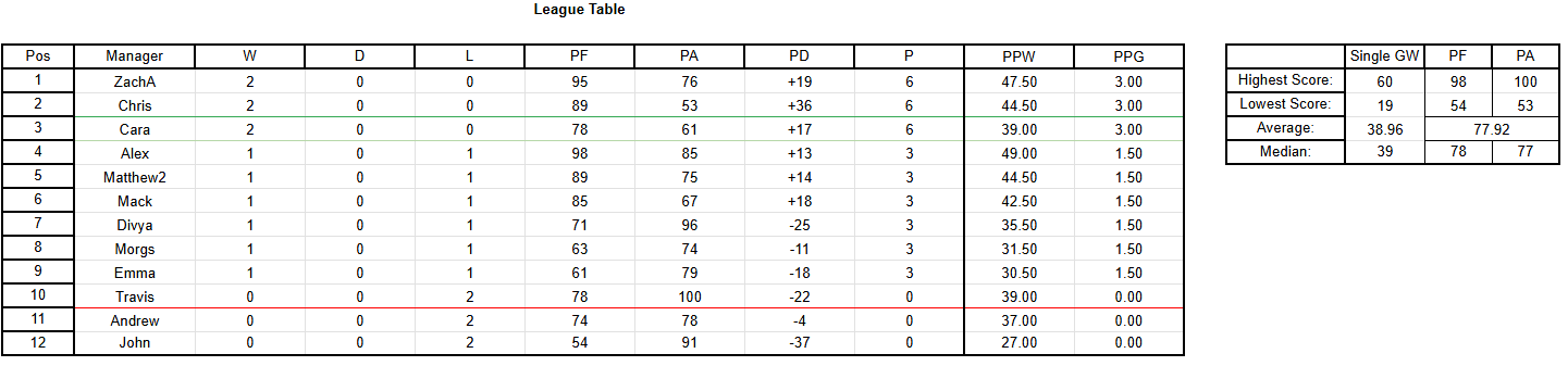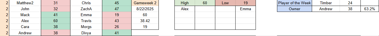 Hello everyone and welcome to gameweek 3! Waivers this week are due on Friday at 3am PDT / 6am EDT as the games start on Saturday! This week saw some interesting matches, headlined by Divya's narrow victory over Andrew, 41-38. Elsewhere, Chris pulls off a huge 45-31 win over me and Alex fends off a Travis 43 pointer with 60 points of his own. Full results are as follows: