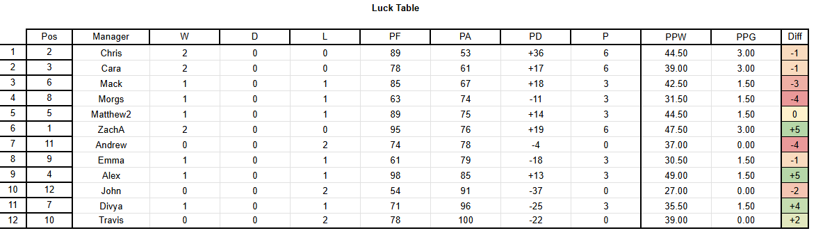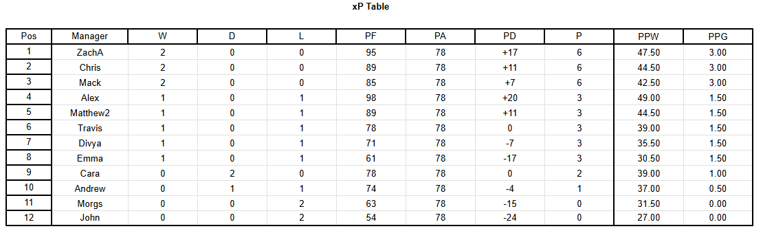 And next week sees our first week of cross-league matchups! The headliner of the week being one of two undefeated matchups: MatthewR vs Andrew! The other being Jesse vs the current table leader, Alex. Other matchups to keep an eye on include me vs ZachA in what should be an interesting Mitoma derby, Luke vs Matthew2, Dylan vs Mack, and a battle between two teams with near identical PF in Zach vs Travis.