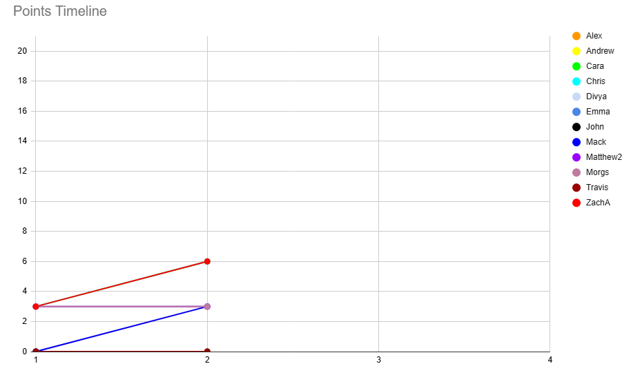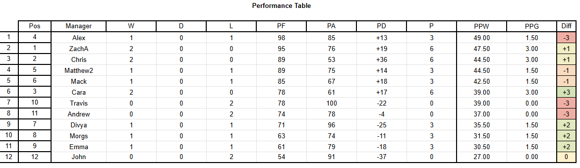 Next week will see some great matchups, headlined by two undefeated teams in ZachA vs Cara. Elsewhere, two more of our high scorers will face off as Chris takes on Alex. Should be a good week of matchups! Full matchups are as follows: