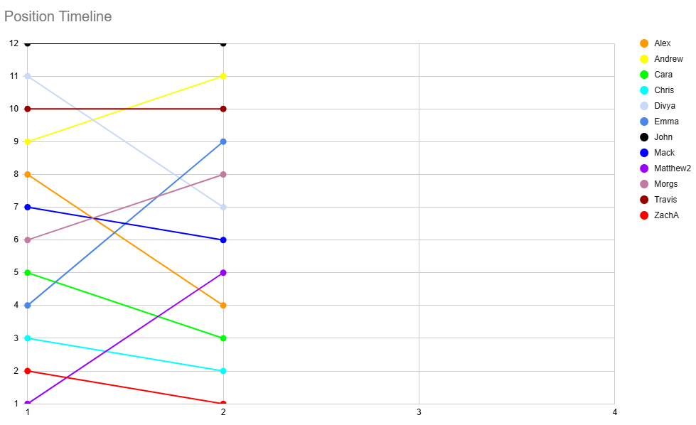 These results see just 3 undefeated teams remain, led by Zach! Chris sits just 6 PF behind and Cara another 17.