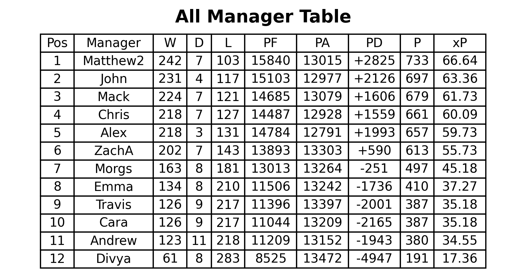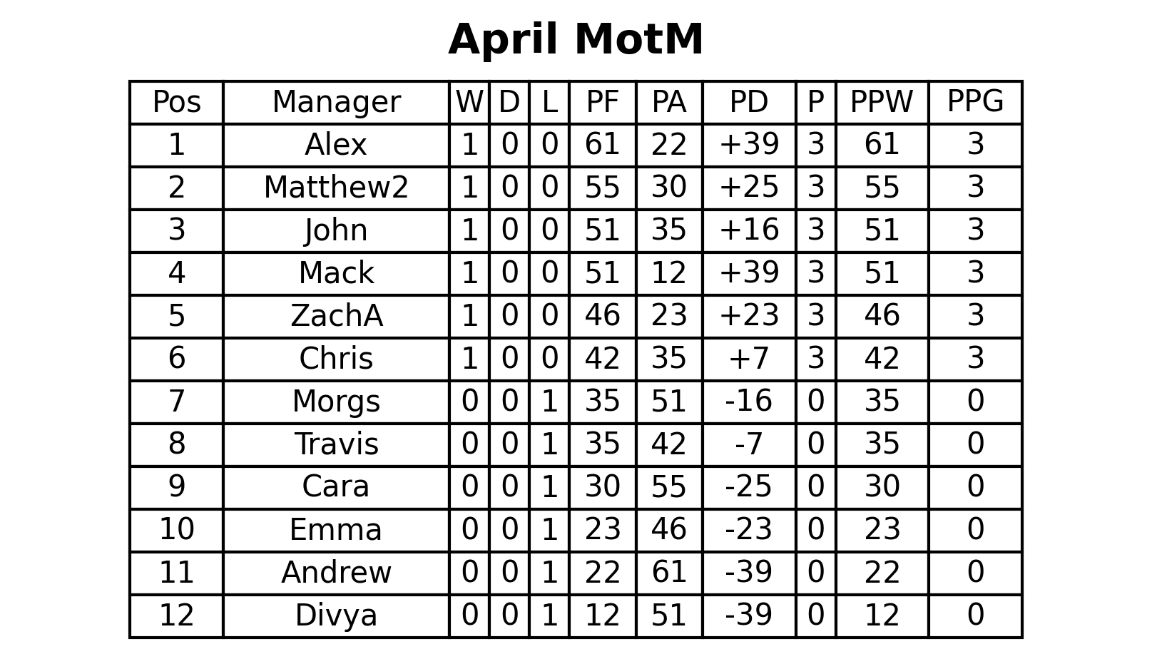 One week into April and Alex takes the top spot with 61 PF! Me, John, and Mack are the only 3 managers above 50 PF!