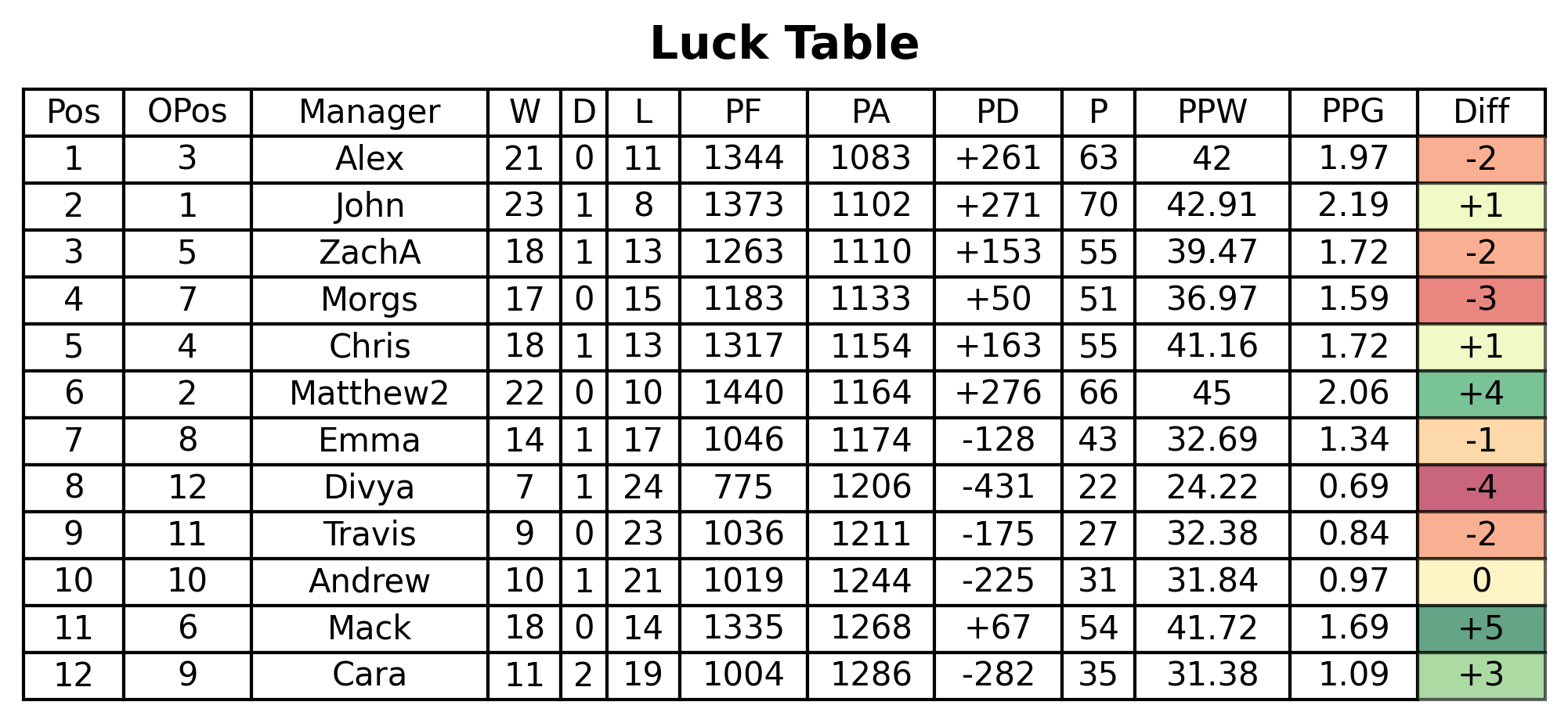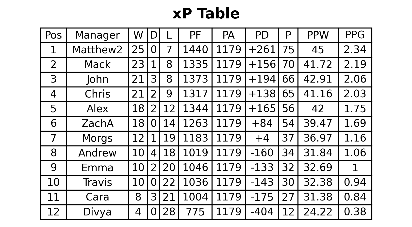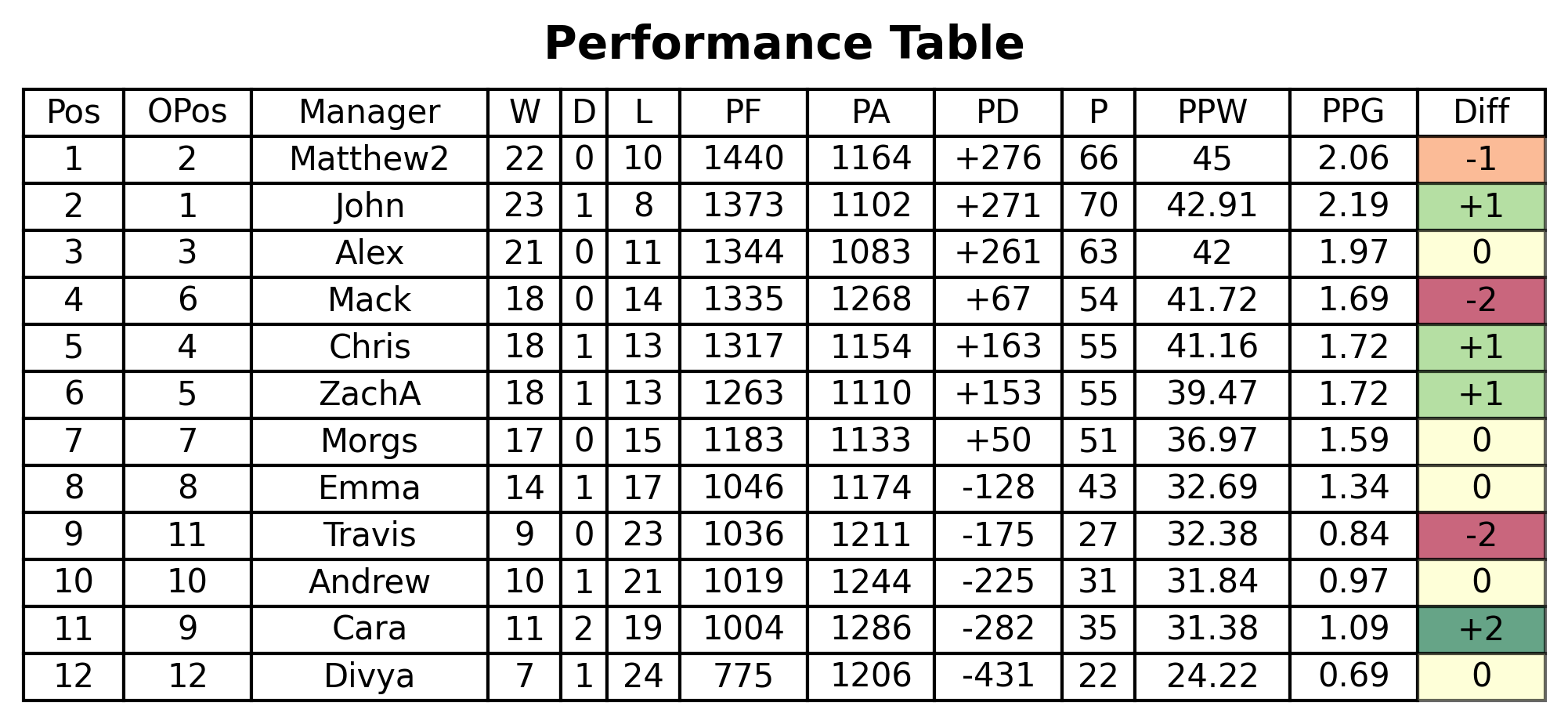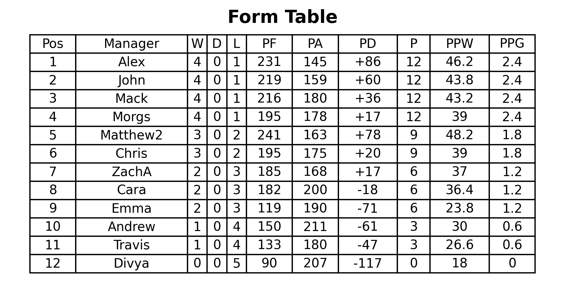 Taking a look at the form table, we see Alex, John, Mack, and Morgs all on 12/15 points in the past five weeks!